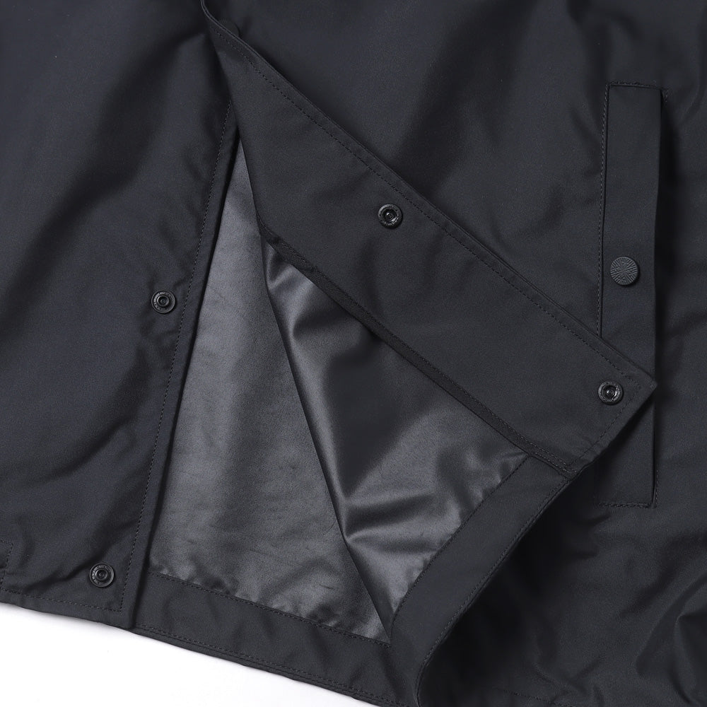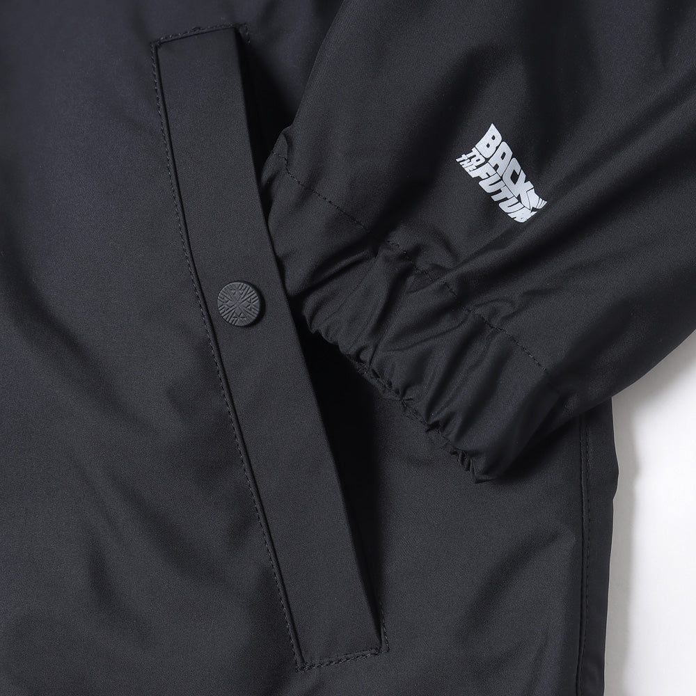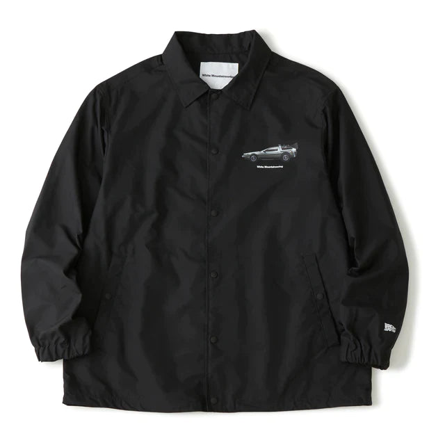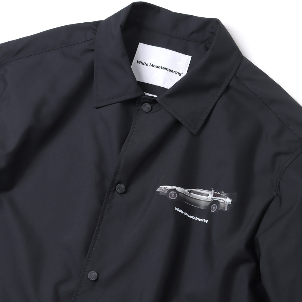 映画"Back to the future"コラボレーションのWMコーチJKT。アイコンであるデロリアン(DMC-12)のグラフィックを大胆にプリント。高密度に織り上げたツイル素材。緯糸に高捲縮糸を使用しておりポリウレタンを使用したようなストレッチ性が有ります。ケマーズ社のテフロン撥水加工を施しており、耐久撥水性・撥油性・防汚性を発揮する素材です。