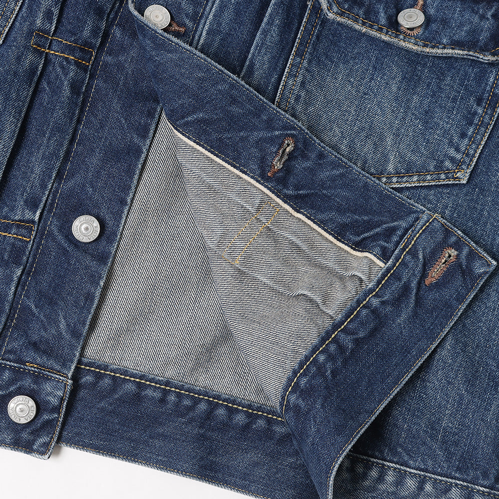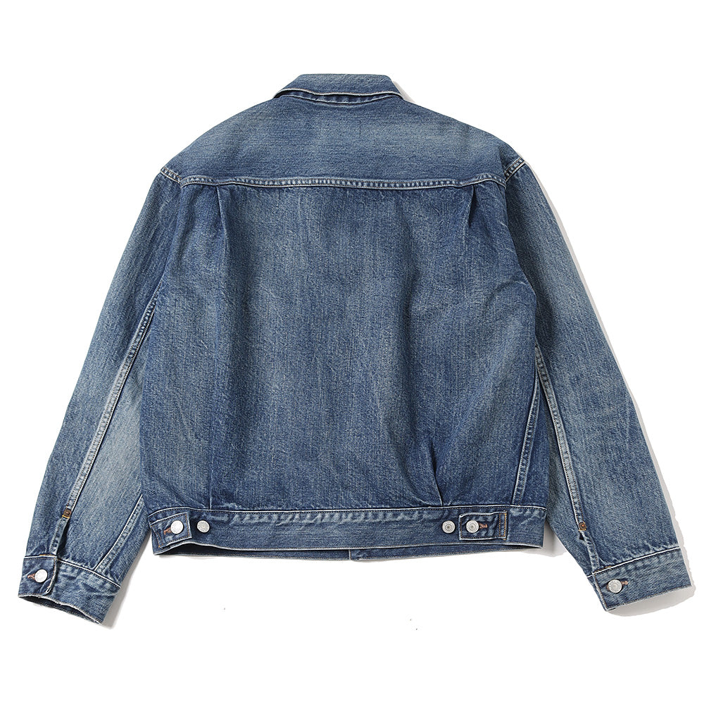 両胸のフラップ付きポケット、フロントプリーツが特徴のデニムジャケット。