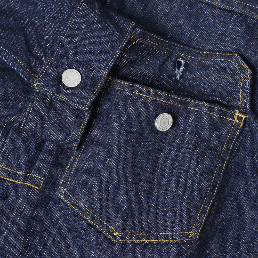 両胸のフラップ付きポケット、フロントプリーツが特徴のデニムジャケット。