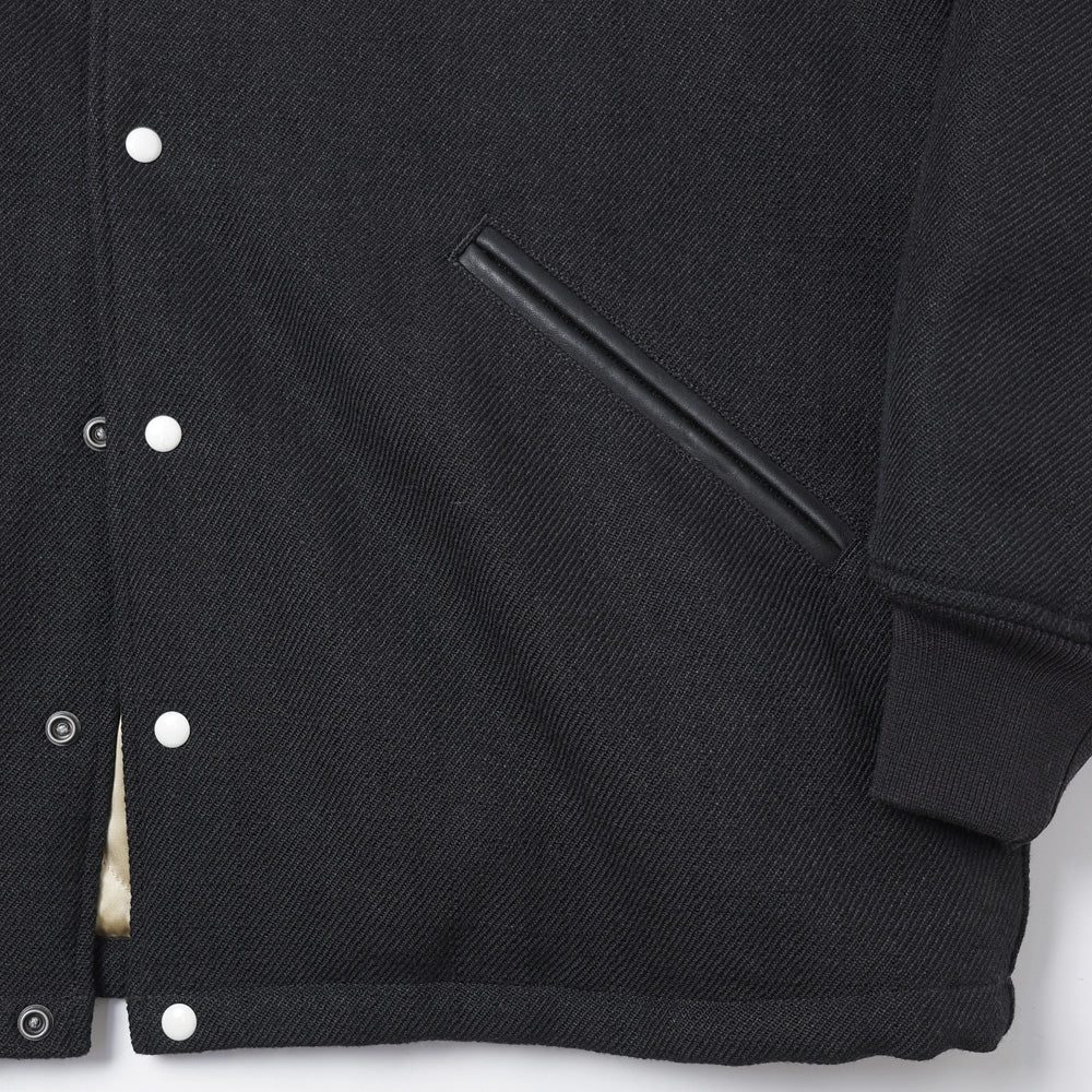 前開きはスナップボタン開きで両腰にレザー両玉縁ポケットが付きます。