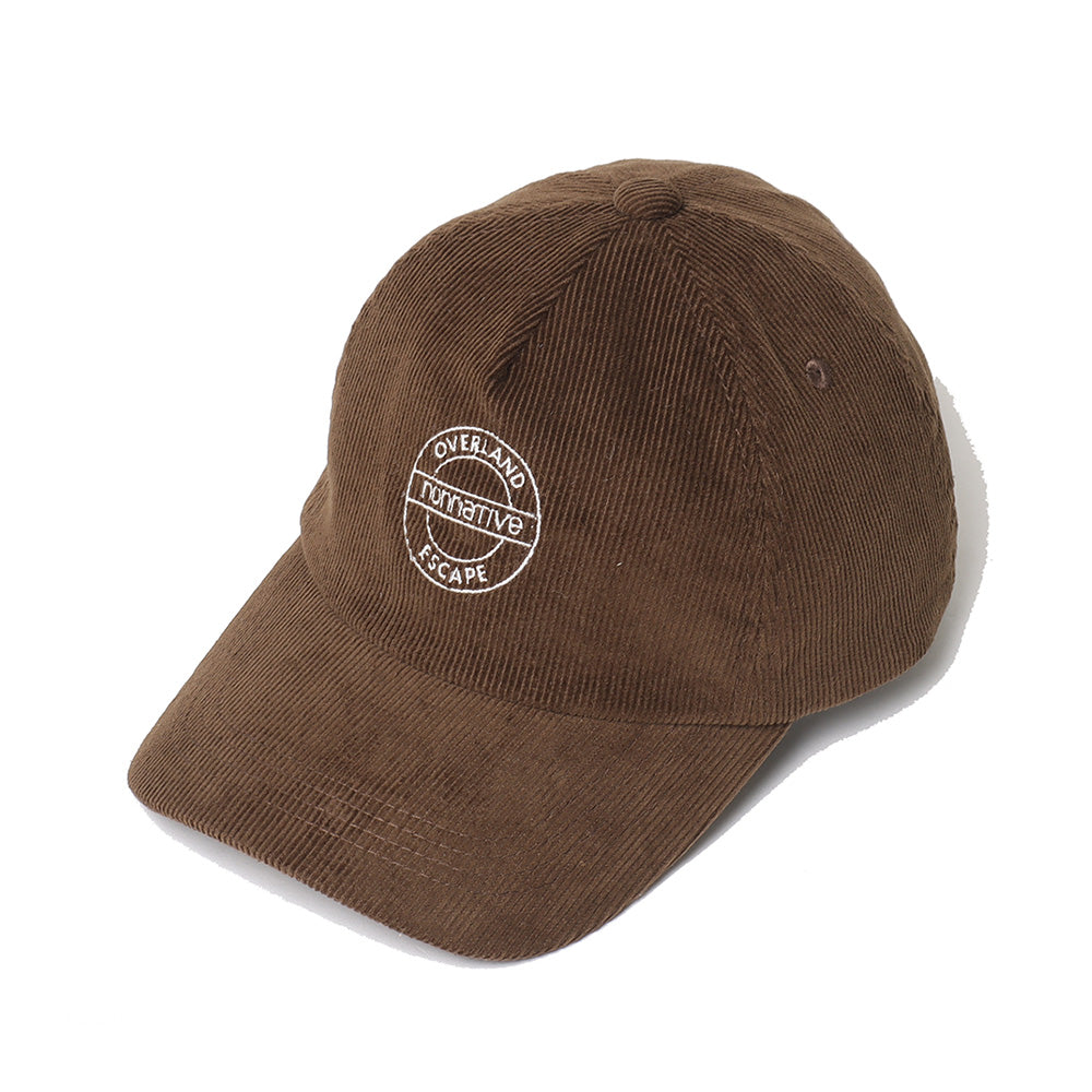 今回のコレクションテーマである"OVERLAND ESCAPE"のロゴを刺繍で入れたコーデュロイキャップ。
