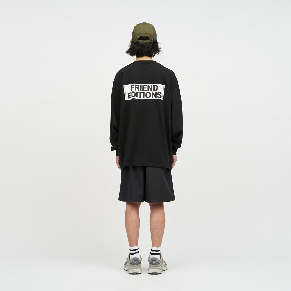 2022年にニューヨークでOliver Shawによって設立されたFREND EDITIONSは、アート、出版、プロダクトを通じてコミュニティの構築を目指すプラットフォーム。小部数の書籍やジン、アートブック、限定プロダクトの制作を行い、新進気鋭から著名アーティストまで幅広く支援している。FREND EDITIONSのアートワークをFreshServiceのプロダクトに落とし込んだカプセルコレクション。FE x FSによる特別仕様のALL WETHER SHORTS。FE x FSによる特別仕様のALL WETHER SHORTS。ハリがありマットな無質感のナイロンを採用し、内側のメッシュライナーは健在で、水陸両用、スイムウェアとしても活躍する1枚。ゴム仕様のウエストにロゴを施したテープベルトがアクセント。