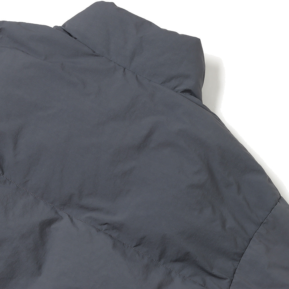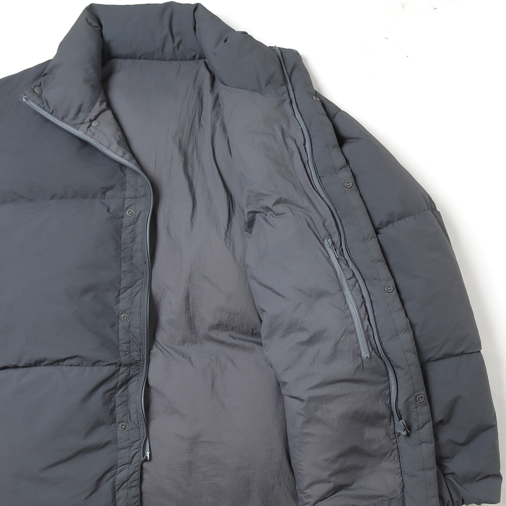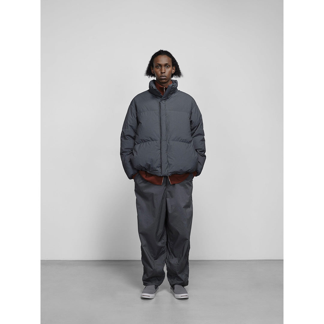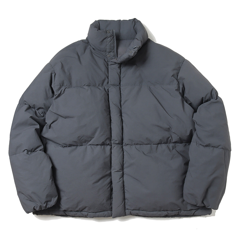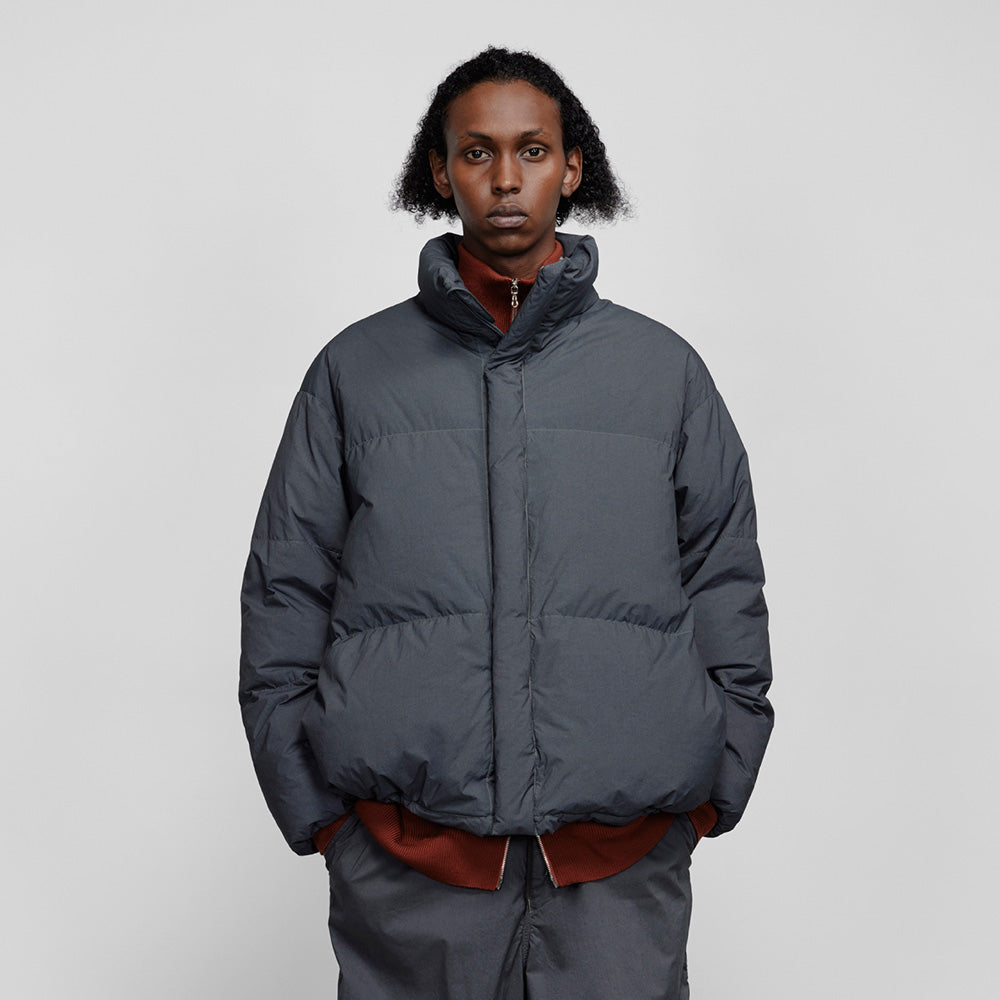 高密度に製織して表面を微起毛させた無染色のナイロンを使用したダウンジャケット。縫製後に染色を施すことで独特な色ムラや縮みによるパッカリングとアタリ、ドライな質感でペーパーライクなハリ感も特徴。大胆に3分割したダウンルームに良質な羽毛をパンパンに詰め込んだボリュームのあるシルエットが主張する1着。