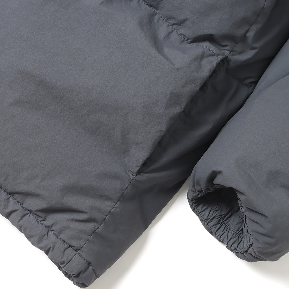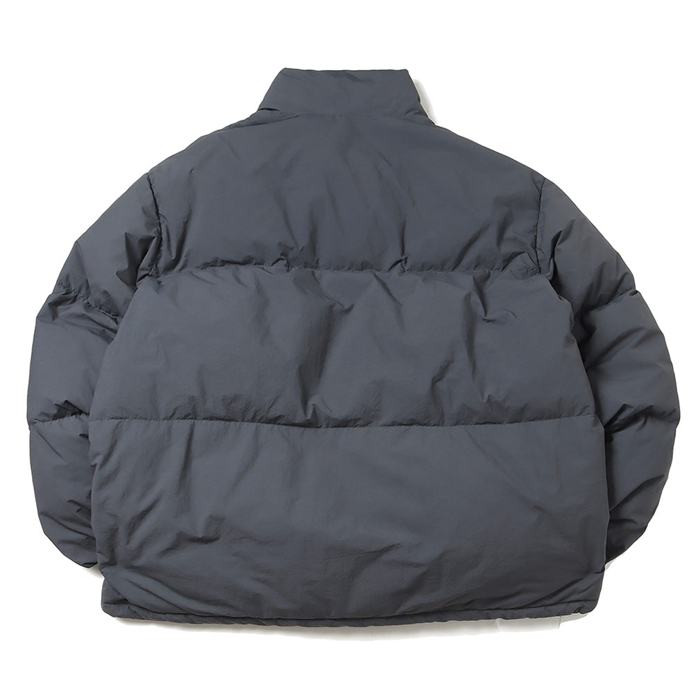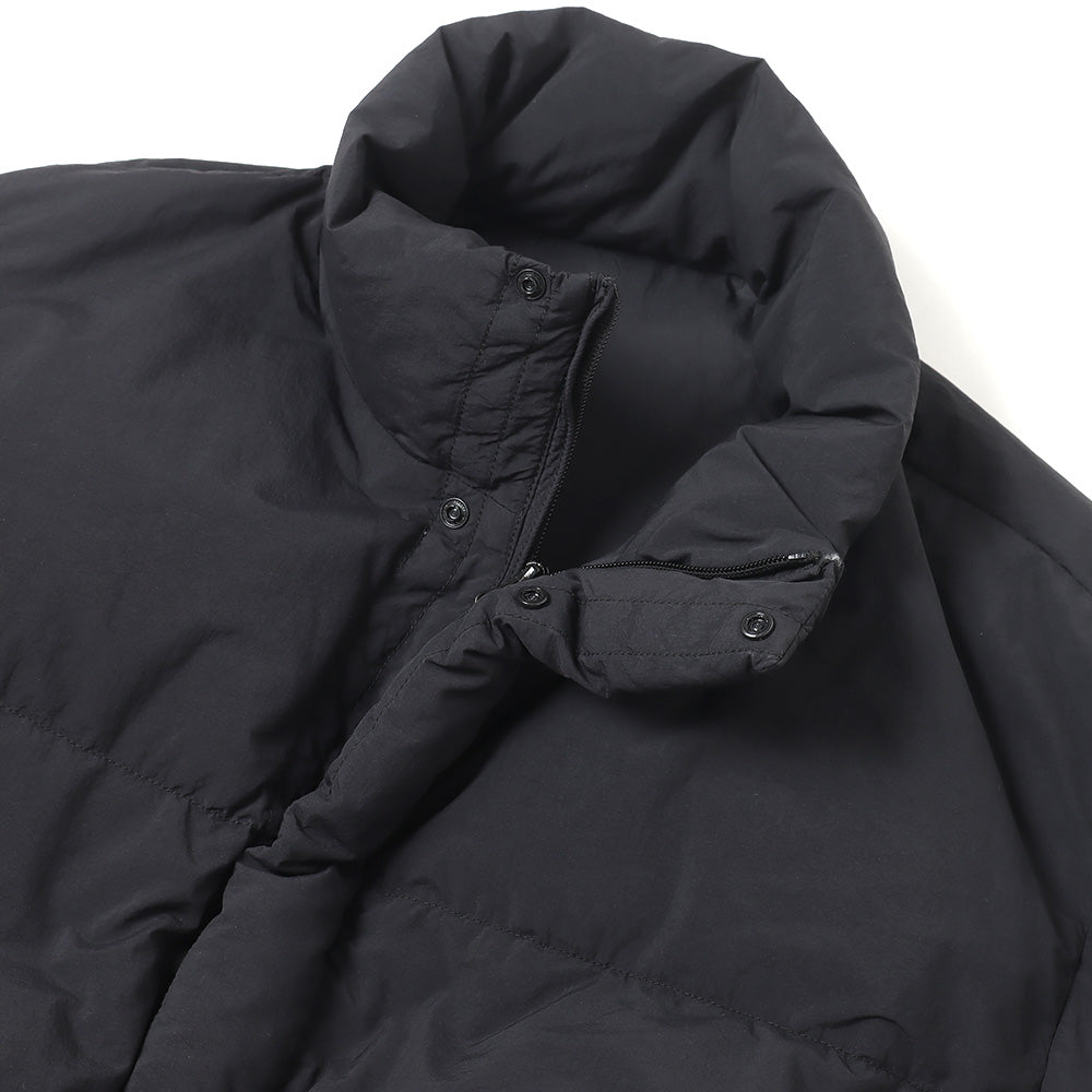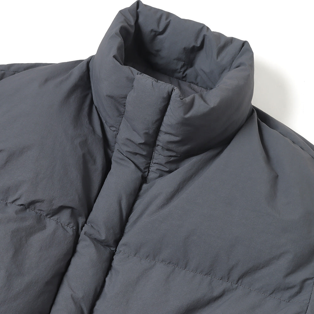 高密度に製織して表面を微起毛させた無染色のナイロンを使用したダウンジャケット。縫製後に染色を施すことで独特な色ムラや縮みによるパッカリングとアタリ、ドライな質感でペーパーライクなハリ感も特徴。大胆に3分割したダウンルームに良質な羽毛をパンパンに詰め込んだボリュームのあるシルエットが主張する1着。