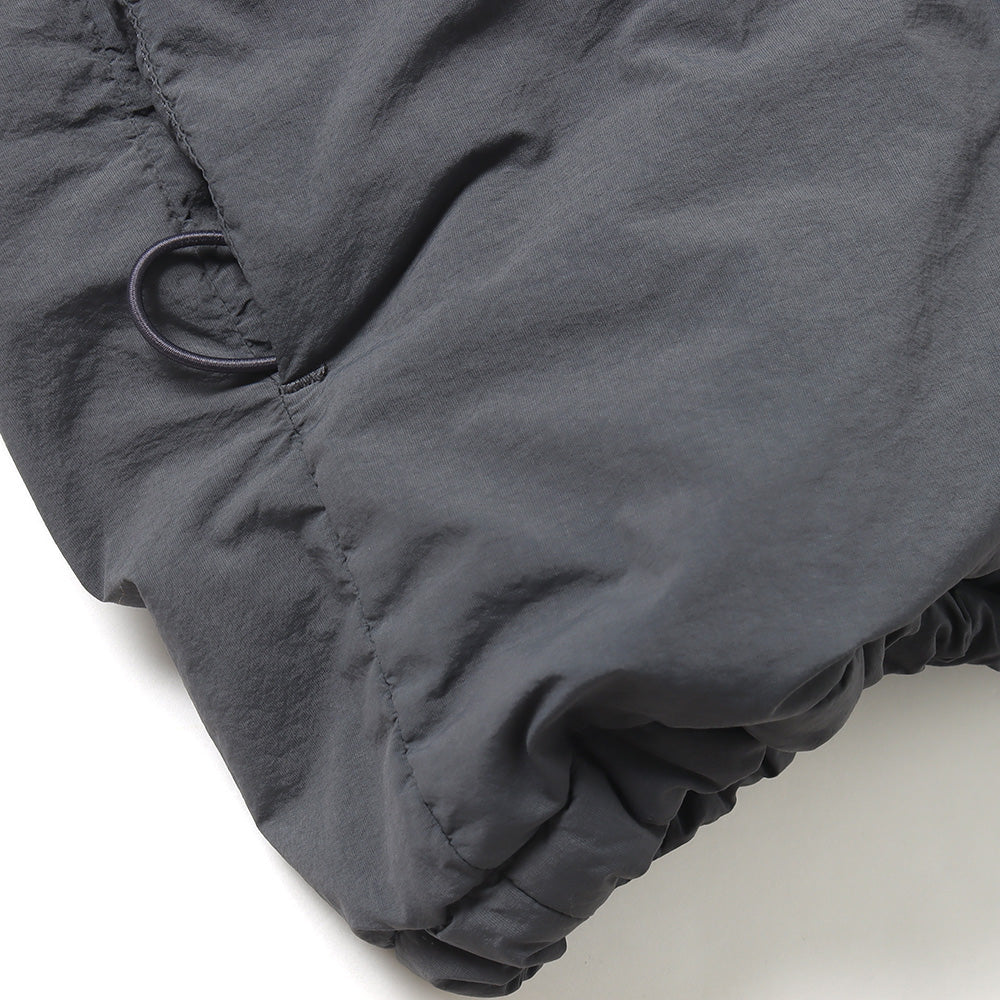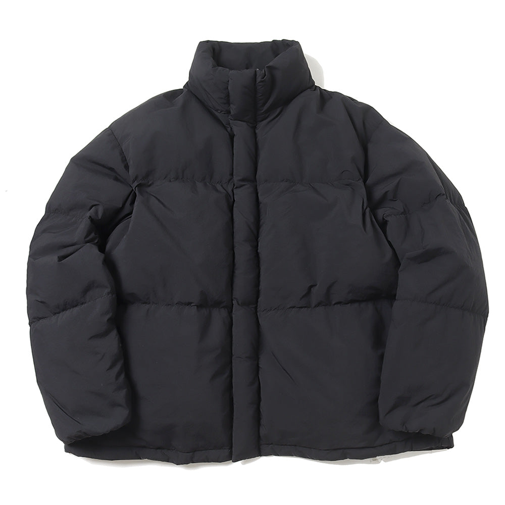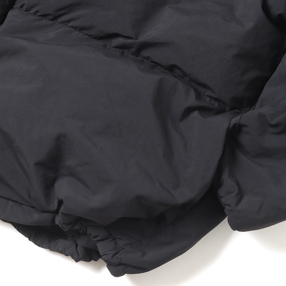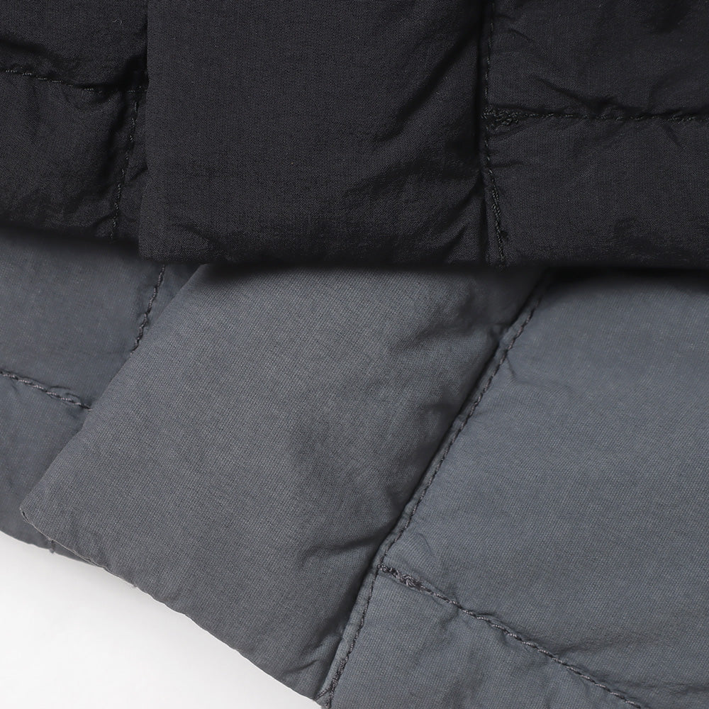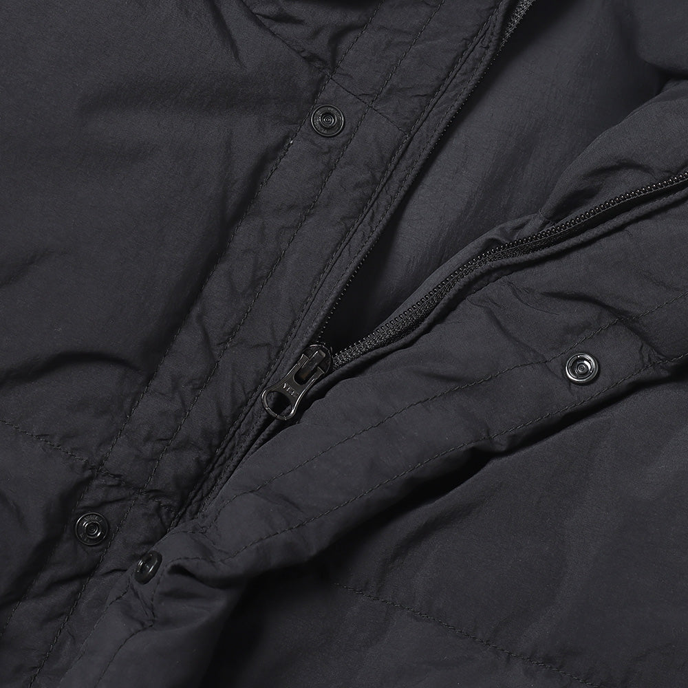 高密度に製織して表面を微起毛させた無染色のナイロンを使用したダウンジャケット。縫製後に染色を施すことで独特な色ムラや縮みによるパッカリングとアタリ、ドライな質感でペーパーライクなハリ感も特徴。大胆に3分割したダウンルームに良質な羽毛をパンパンに詰め込んだボリュームのあるシルエットが主張する1着。