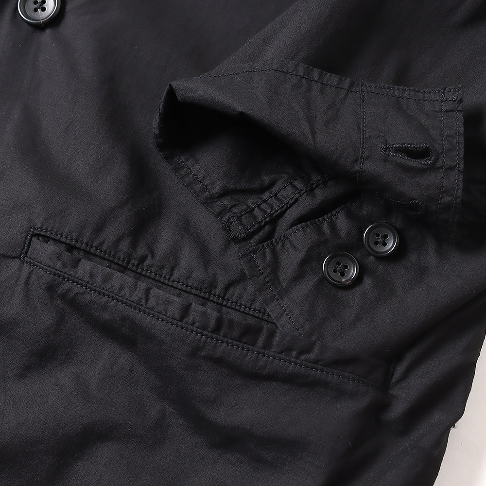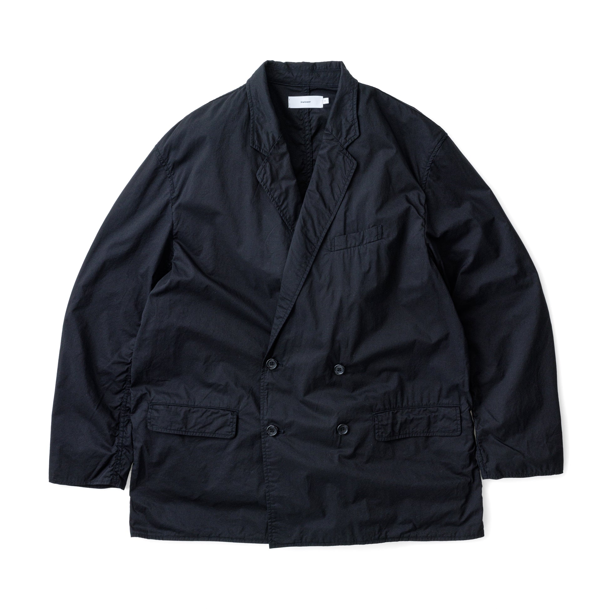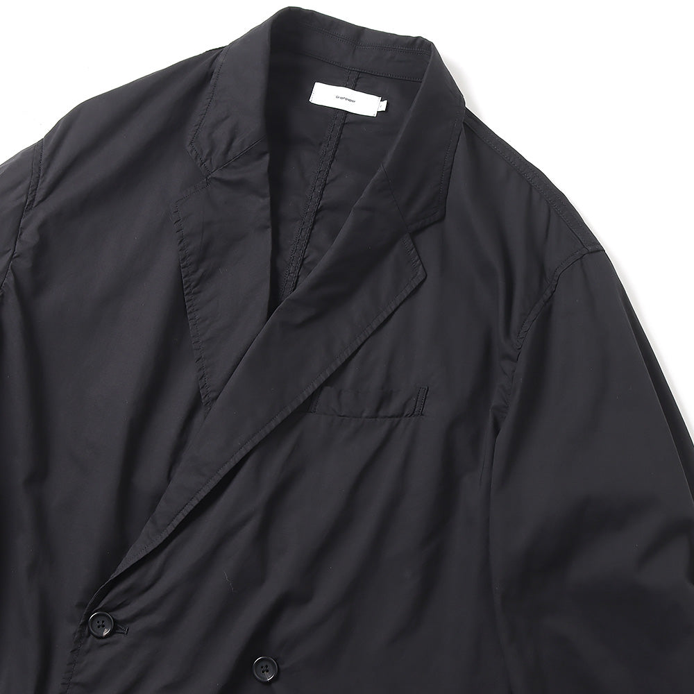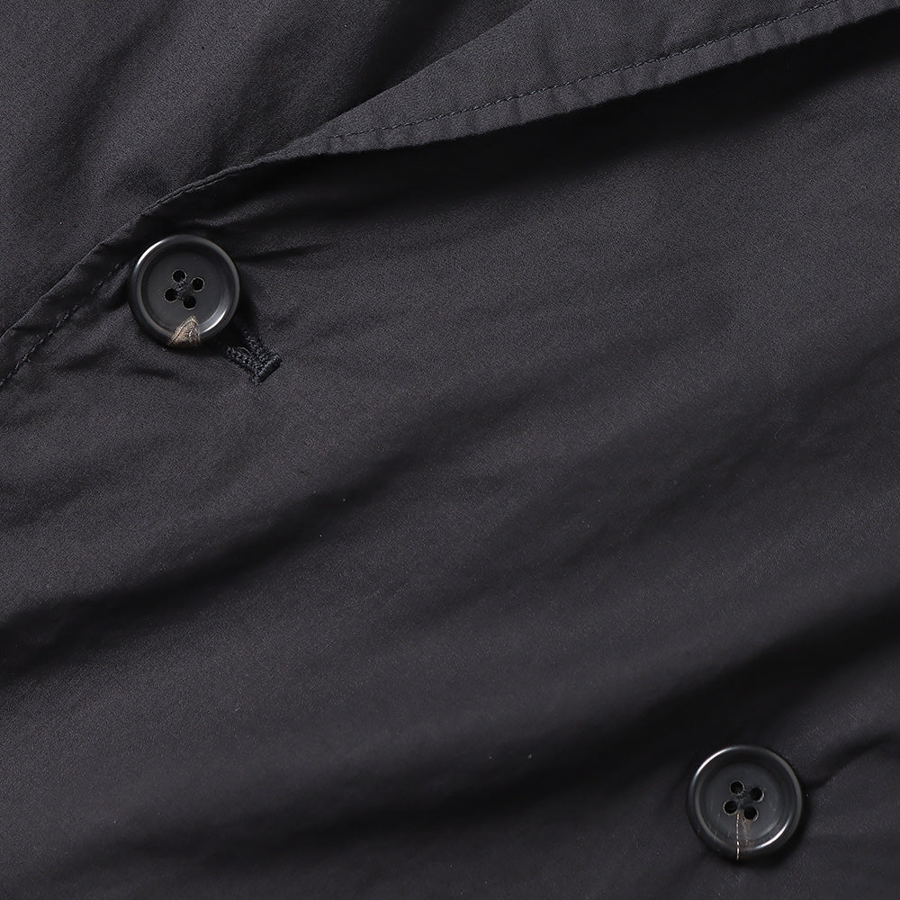 非常に繊細でありながら高密度に織り上げることで滑らかな肌触りと程よいハリ感が特徴のコットンタイプライター。その生地を表裏ともに使用した無双仕立てのダブルジャケット。太番手の糸で巻き縫いし、製品染めをすることで縮みによるアタリと独特な風合いが魅力。ボリュームを持たせたボックスシルエットで3サイズ展開で体型に合わせたサイズ感を楽しめる。