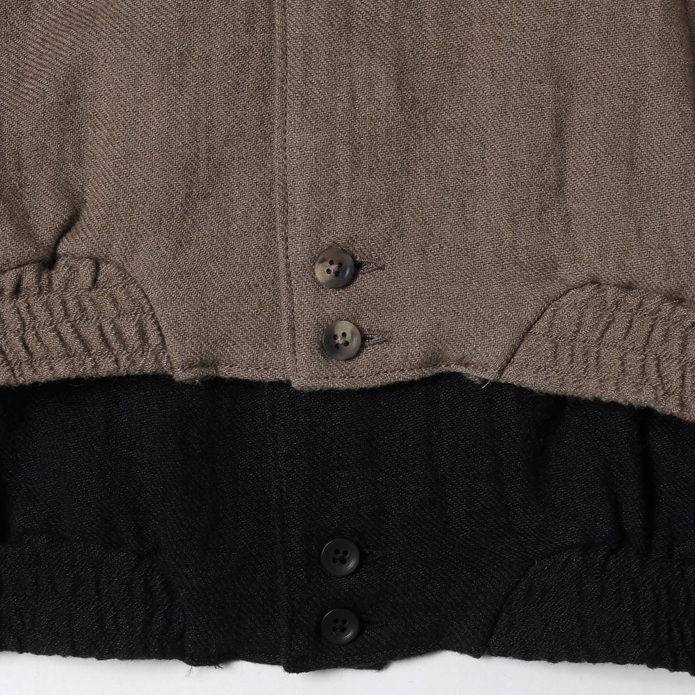 ウエストにエラスティックを配した意匠設計がユニークな新型となる開襟タイプのシャツ。