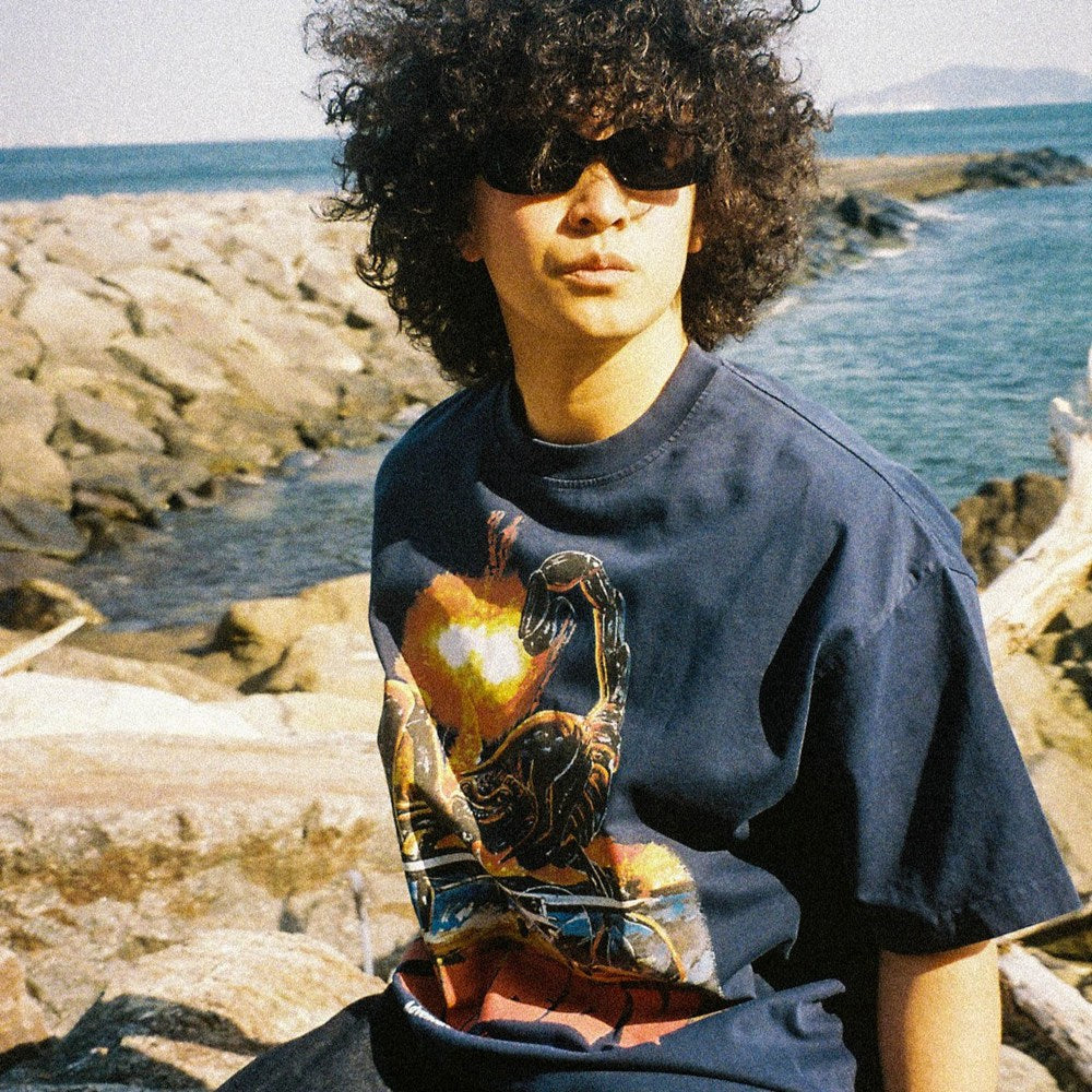 巨大な蠍のモンスターと闘うグラフィックTシャツになります。