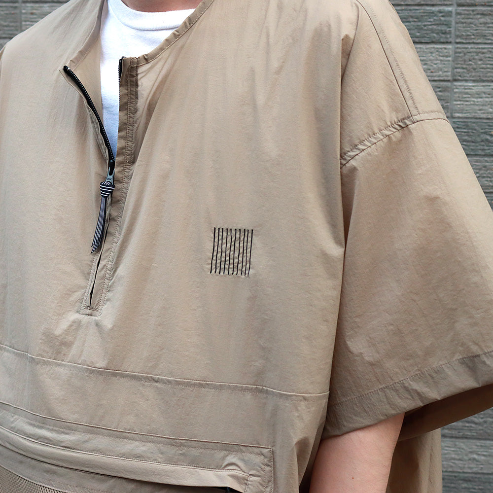 フロントの大きなメッシュポケットが特徴的なワイドシルエットのHALF ZIP CREW SHIRT。 裾にドローコードを付けているのでシルエットアレンジも可能。素材は20Dのナイロンを使った、超軽量・強撥水・ハイストレッチ生地を使用。細い糸を使用しながらも高密度であるため、独特なハリ感・上質な見え方が特徴の素材です。
