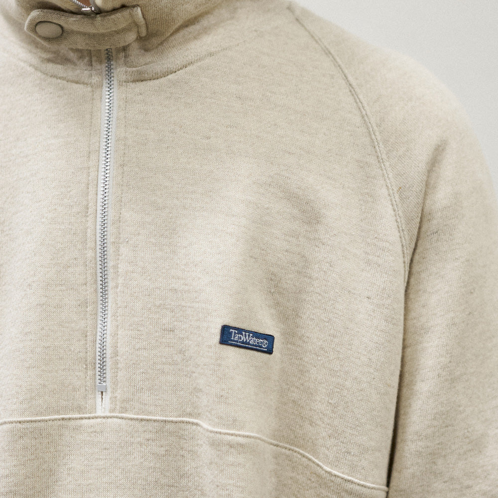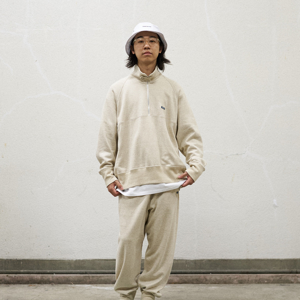 90年代のごく限られた時期に作られたチンストラップ付きのスタンドカラー・スウェットをデザインベースに、コットン/リネン 裏毛スウェットのオリジナル・ファブリックを使用し、ゆとりを持たせたサイズ感に仕上げたハーフジップ・スウェット。