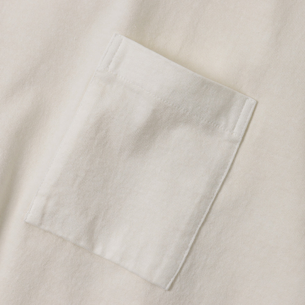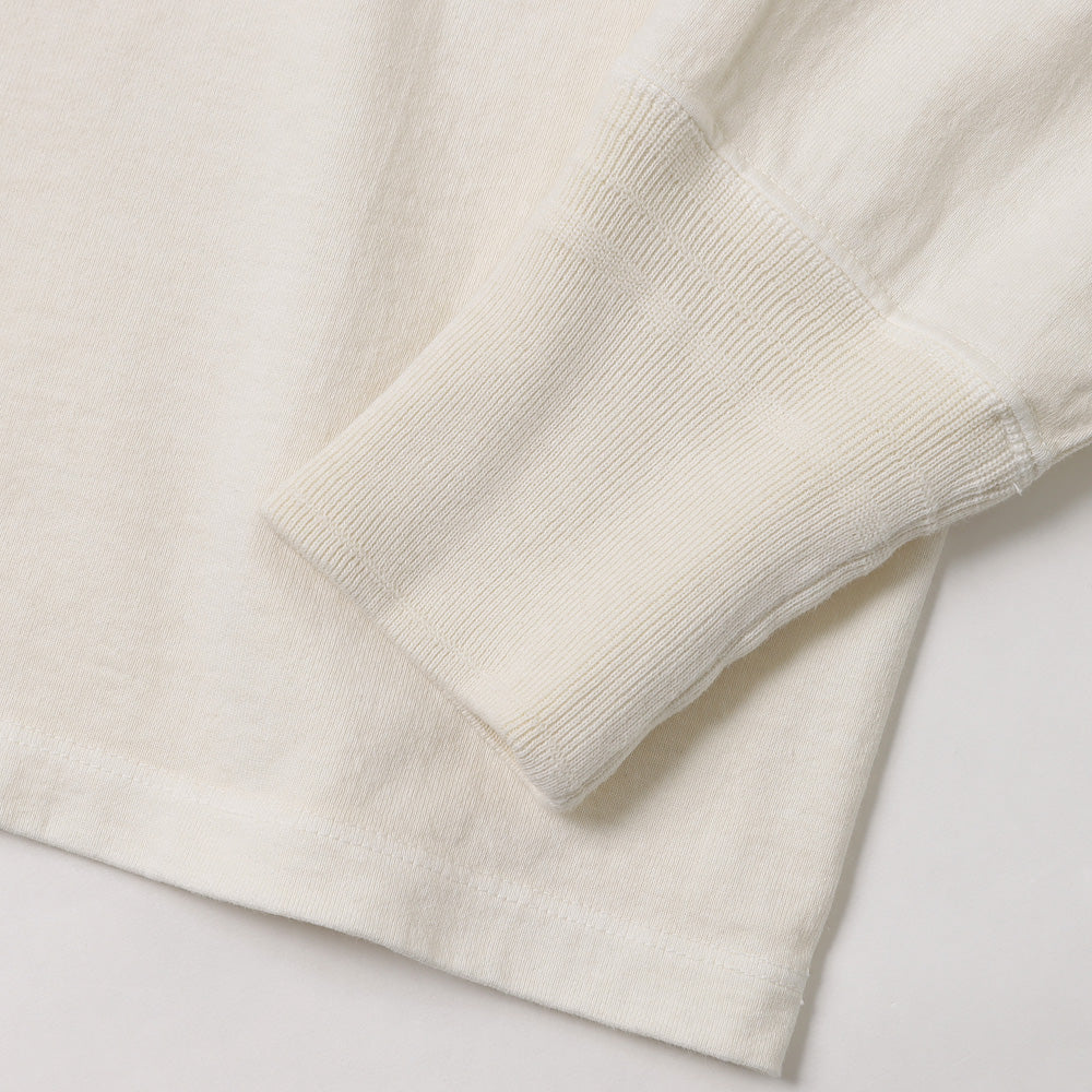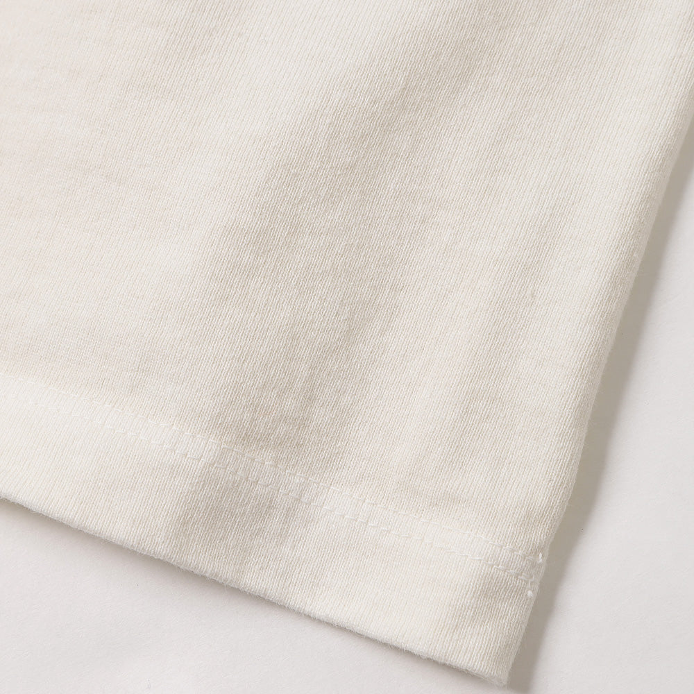 昨年から装い新たになったマテリアルは、 ドライタッチで硬めの質感が特徴の空紡糸を用いて度詰めして編み立てたオリジナル天竺、 ラフでタフ、吸湿性が高く即乾性にすぐれています。