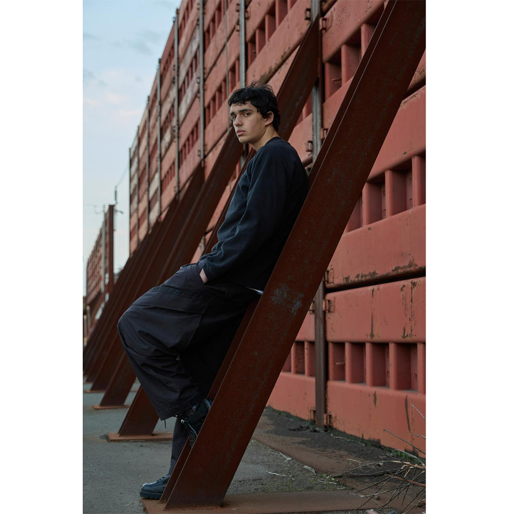 それは独自の解釈でカラーをブラックに統一し、フロント クォーター ポケット スタイルのパンツにカーゴポケットを最大限に大きく斜めに配置し、更にその上部に二段の装備サブポケットを左右に2つ装備した、市場に比類のない独創的な形状のパンツです。