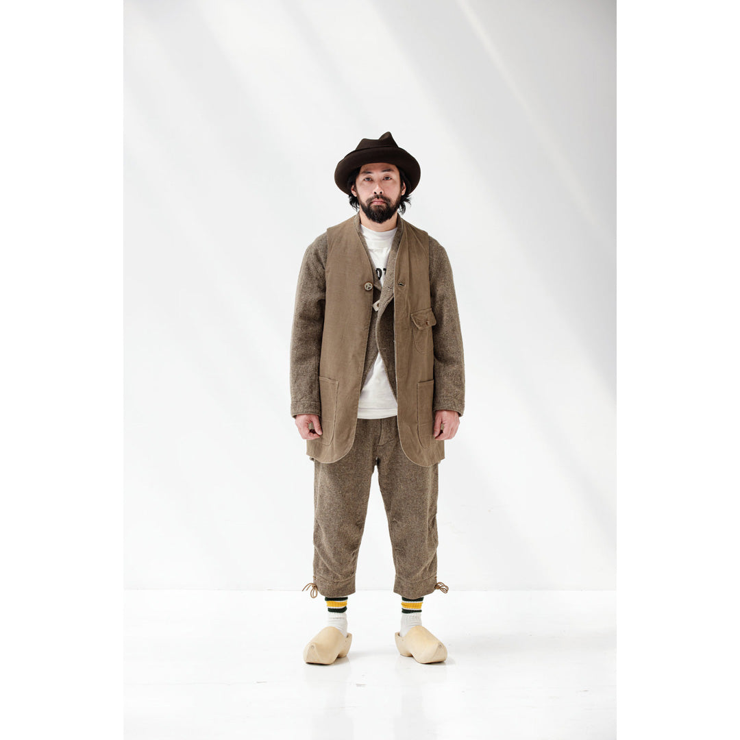 マウンテンリサーチの帽子といえばコレ!といったシンボリックなヘッドウェアは木靴と共にM.F.Tが理想と思い描くコーディネートを完成させるために必要不可欠なもの。帽子界では類を見ないと言われている特注で製作に及んだオリジナル極厚フェルトは、アイコニックなディティールであるブリムの大きな反り返りを表現可能にしつつ、圧倒的な保形力を発揮。脱着可能なスウェットバンドはおなじみのミックスニット。ダークブラウンが一連のツイードとグッドマッチを見せます。