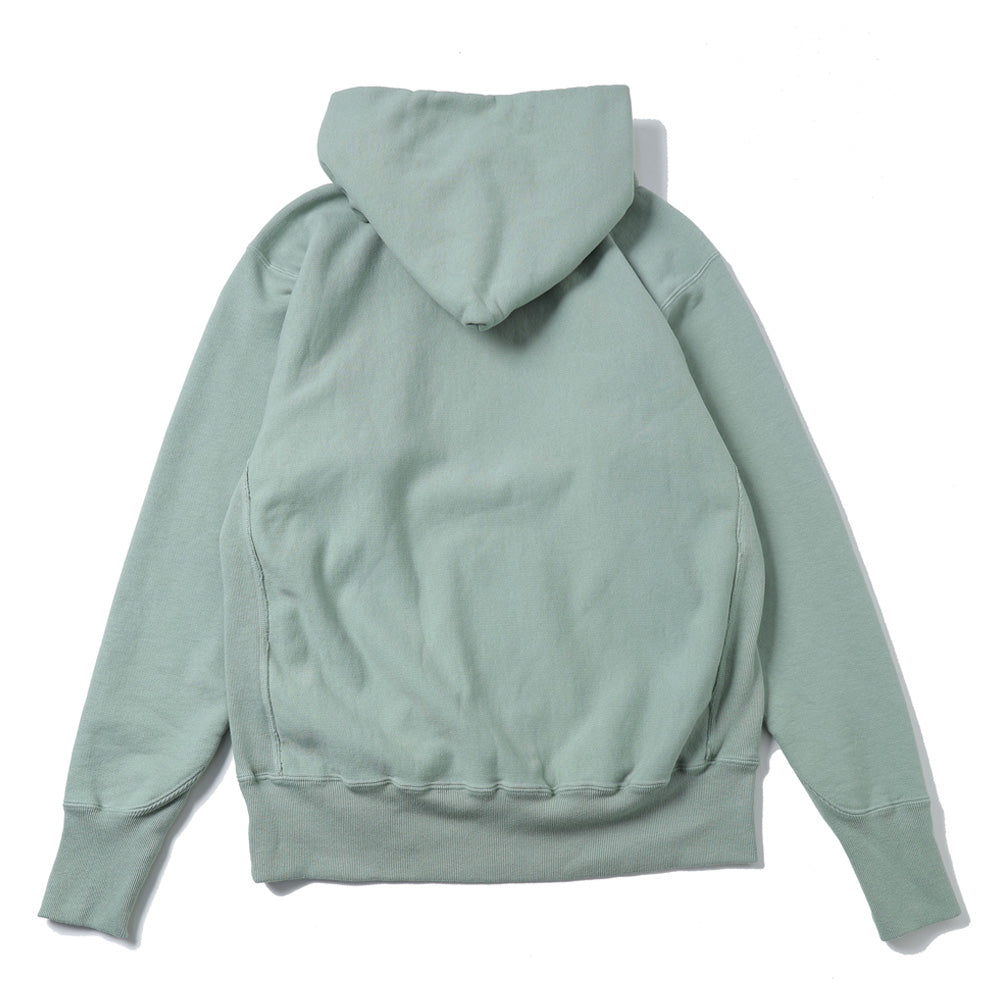太番手の糸を通常のHOODIEの倍の密度で限界まで高密度に、和歌山にて編み上げたジャージにナチュラルダイを施した特別なアイテムです。高密度に編み上げることで生地自体の耐久性は勿論のこと、製品染めをしてしっかりと洗いを掛けている為乾燥機に掛けても縮みが起きないという秀逸なアイテム。裏毛は表面、裏面、その間を繋ぐ面の3層構造。そうすることによって生地の伸びが圧倒的に良くなり、間にたっぷりと空気を含む為、より暖かくなる、エイトンオリジナル裏毛素材です。