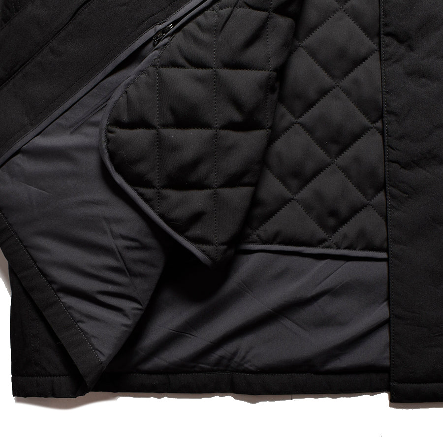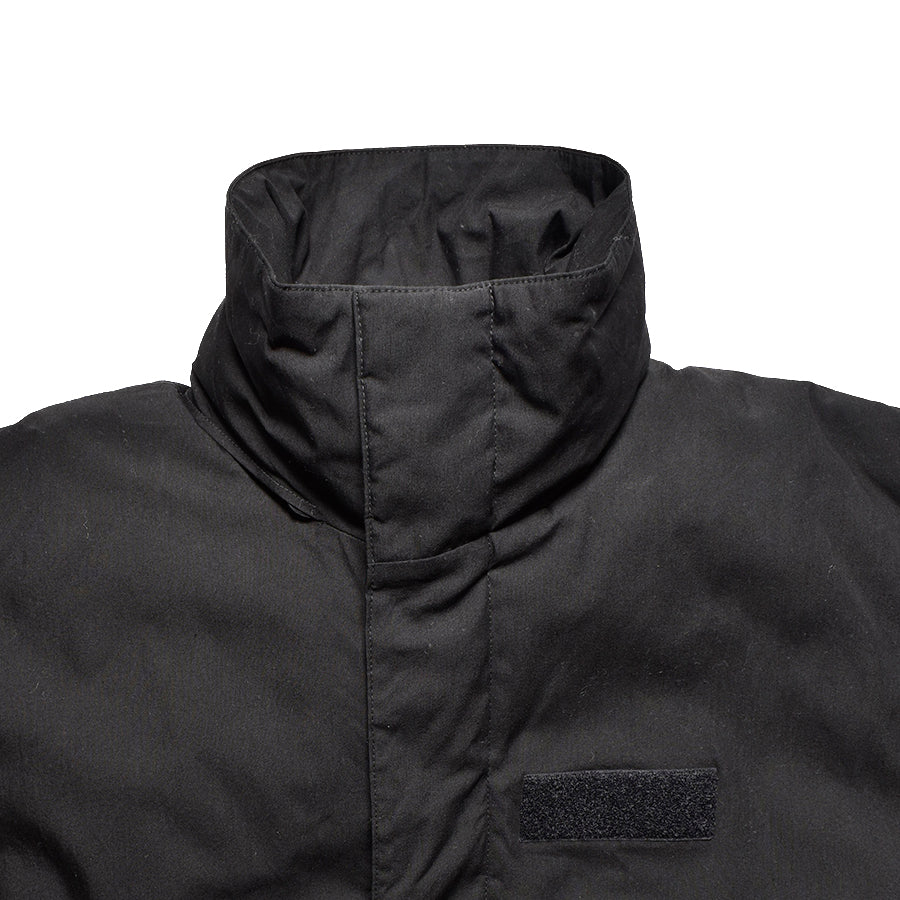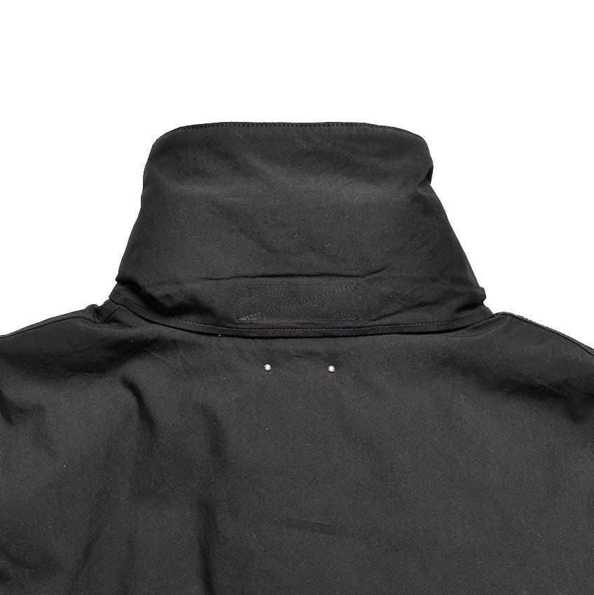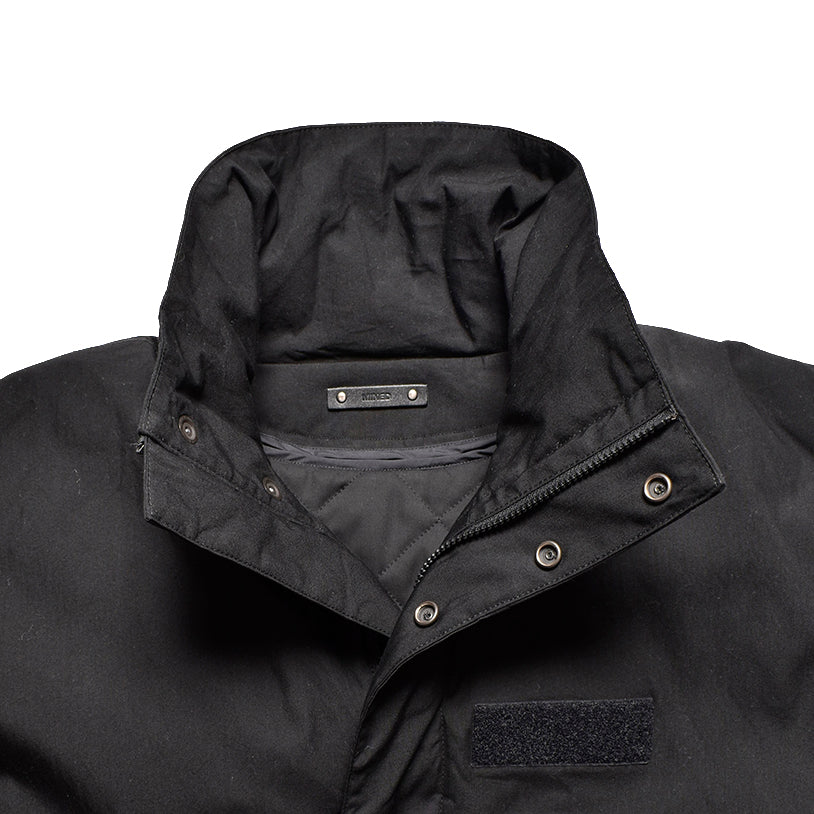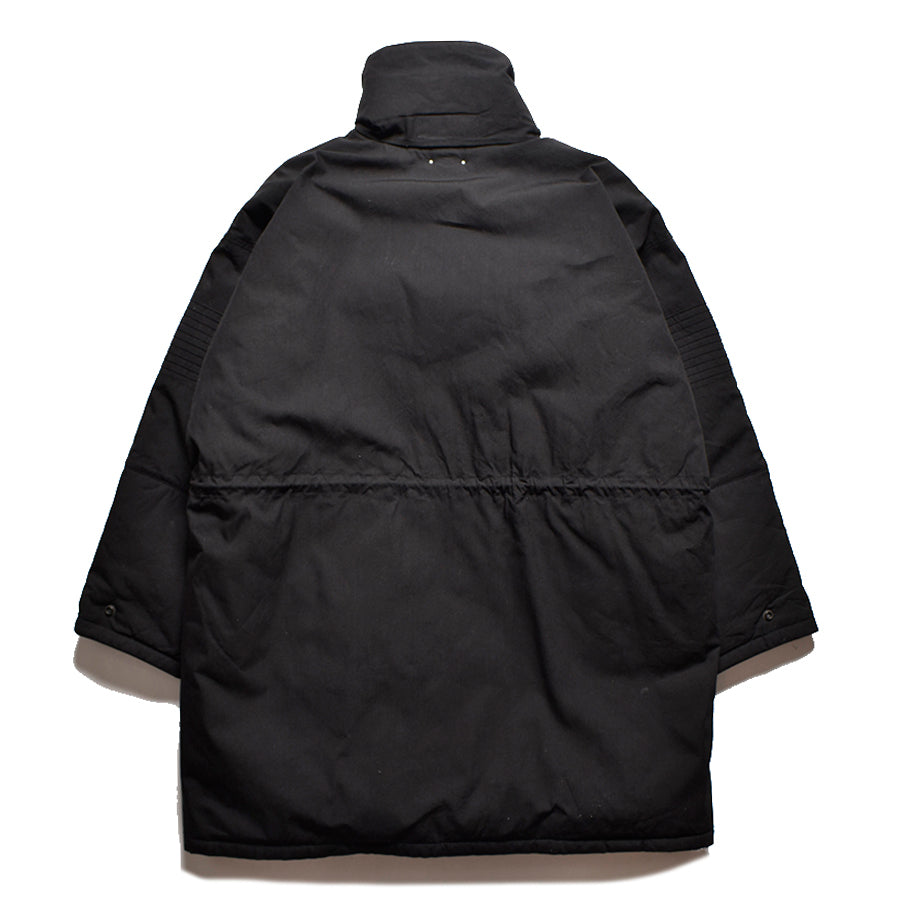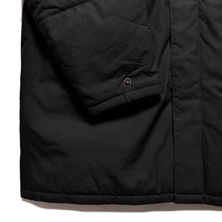 経糸コットン、緯糸ナイロンによって織られたスーパーライトオンスコットンナイロンデニムを使用。スタンドカラー内部にはインフードを内臓し、袖口はアジャストタブ&インナーリブで保温性を高め、身頃内側には取り外し可能なキルティングライナーを装着していたりと、無駄のないミニマムなデザインでありながらもハイスペックな機能性を持たせたスペシャルなアウターとなっている。また袖の切り替え部分のディテール、左胸には軍隊階級章テープのディテールを踏襲しており、アクセントになっている。見た目のボリュームと対照的に軽くて保温性の高いアウター。