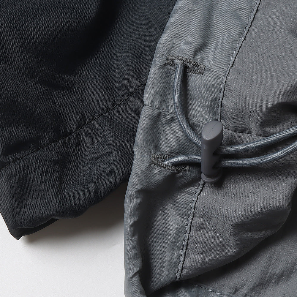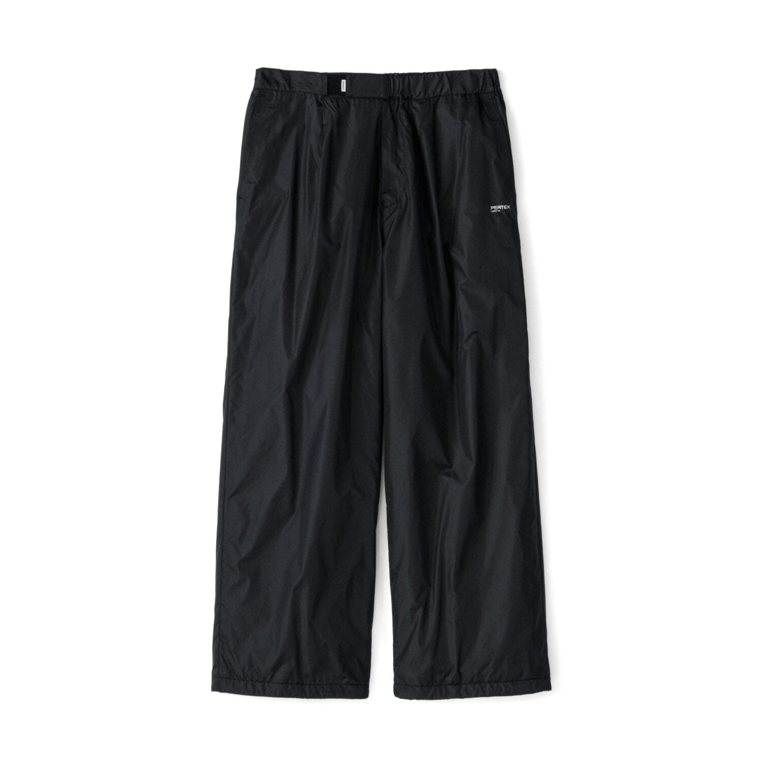 ウエストのサイズを自在に調整できる定番のシェフパンツを非常に細いナイロンを高密度に織り上げた、優れた耐久性と防風性を誇るPERTEX QUANTUMで製作。薄くても高い断熱保温性と吸湿発熱性、制電性を付与した機能素材"コマサーモ"を内蔵した。裾に配したドローコードの調整具合でシルエットに変化をつけた着用も可能。