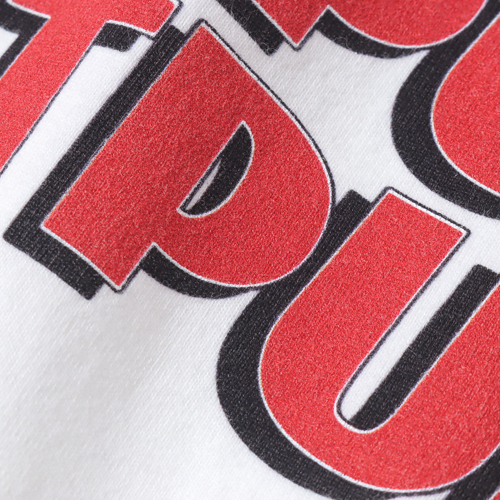 太番手の糸を適正よりハイゲージで編んだ天竺を使用しています。プリント後に何度も洗い、ソフトで着心地の良い風合いに仕上げています。
