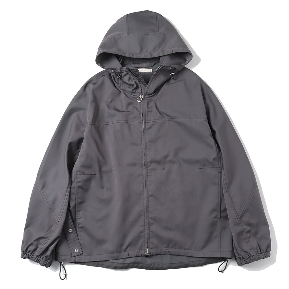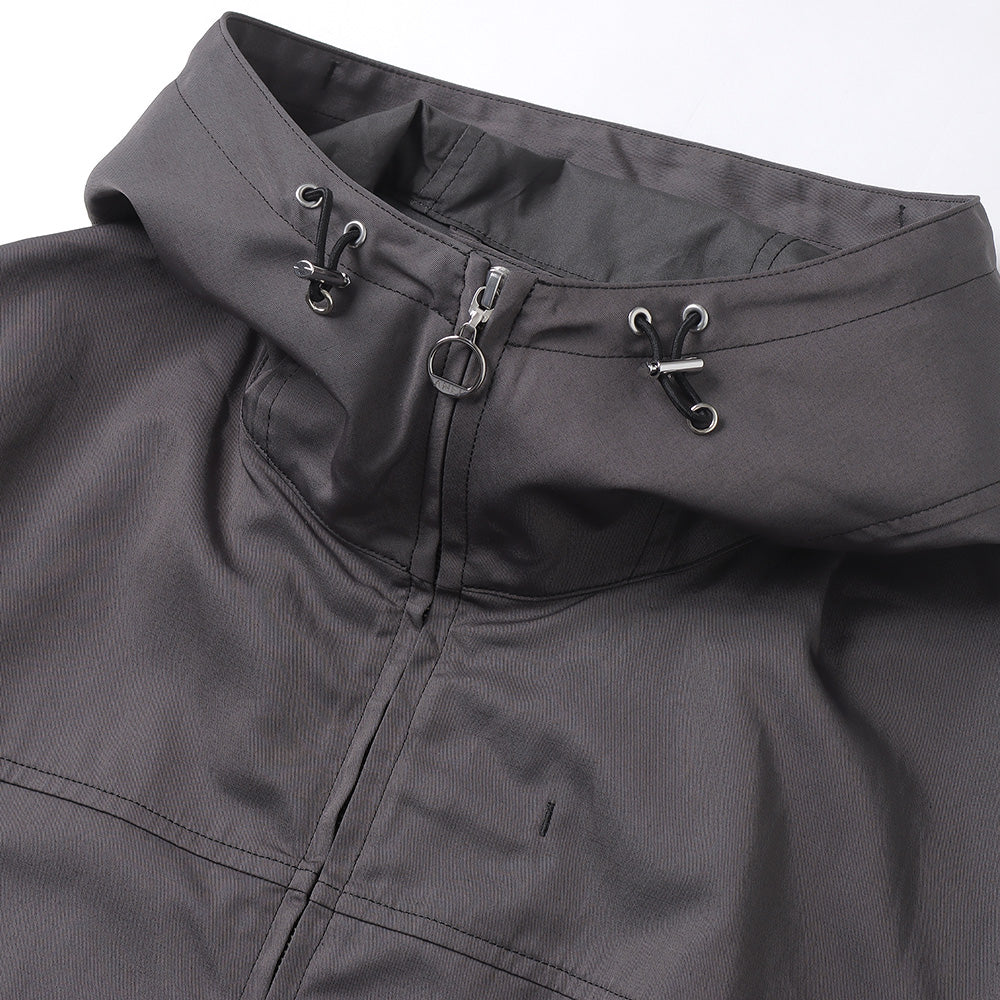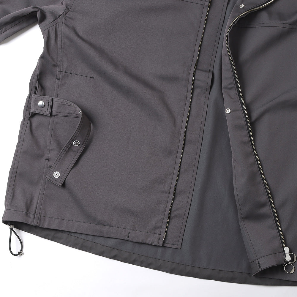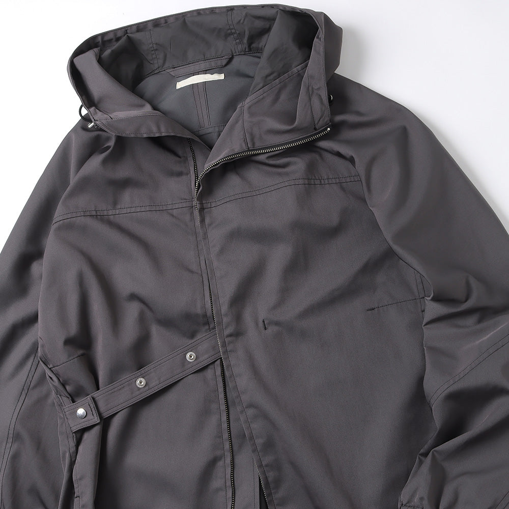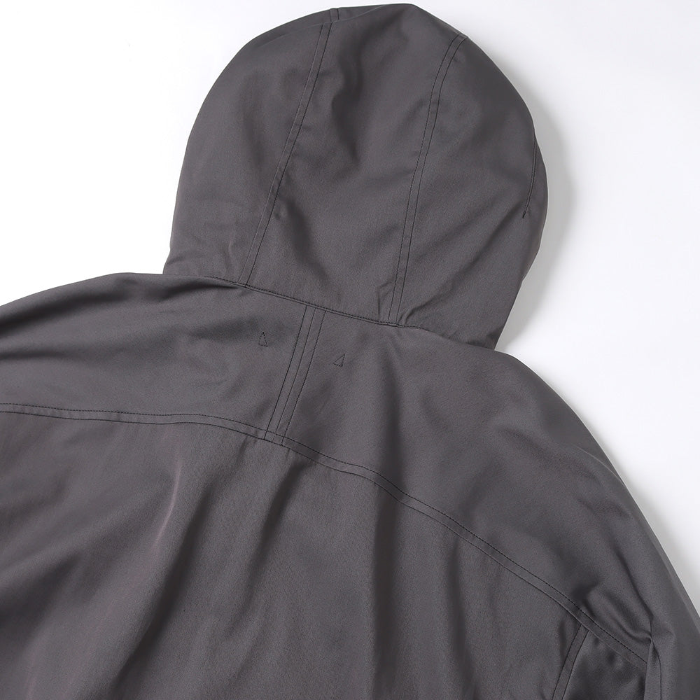 立体的な構造のフード、ソリッドなデザインに重厚感のあるメタルパーツが特徴。フード、裾にはスピンドルにて調整可能です。付属パーツをブラック、シルバーに統一し、デザインアクセントにしております。