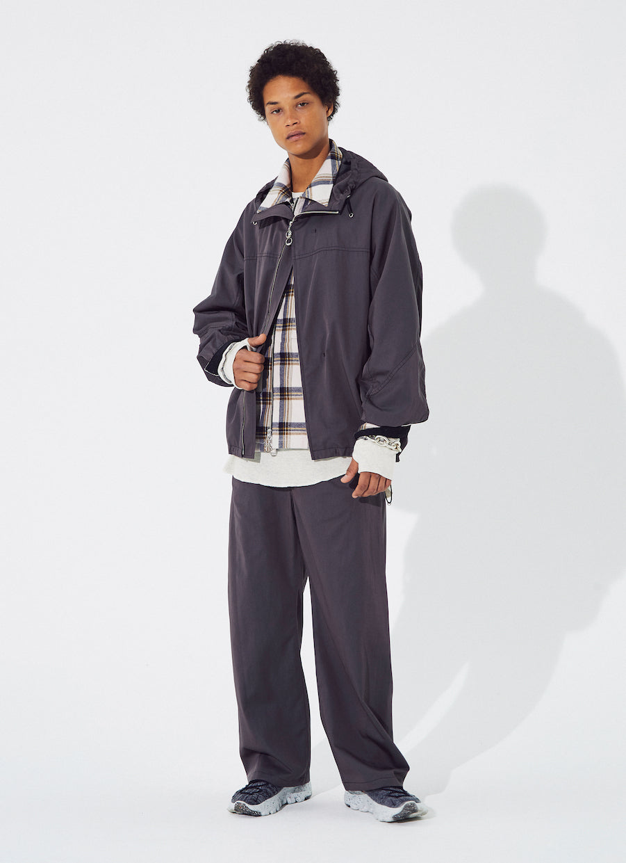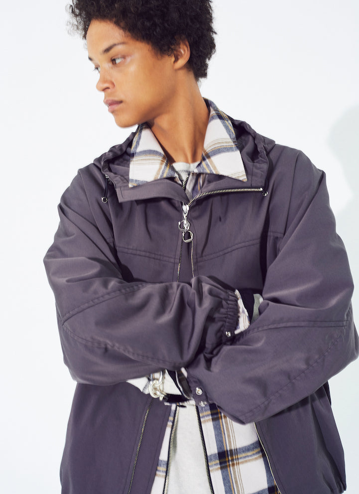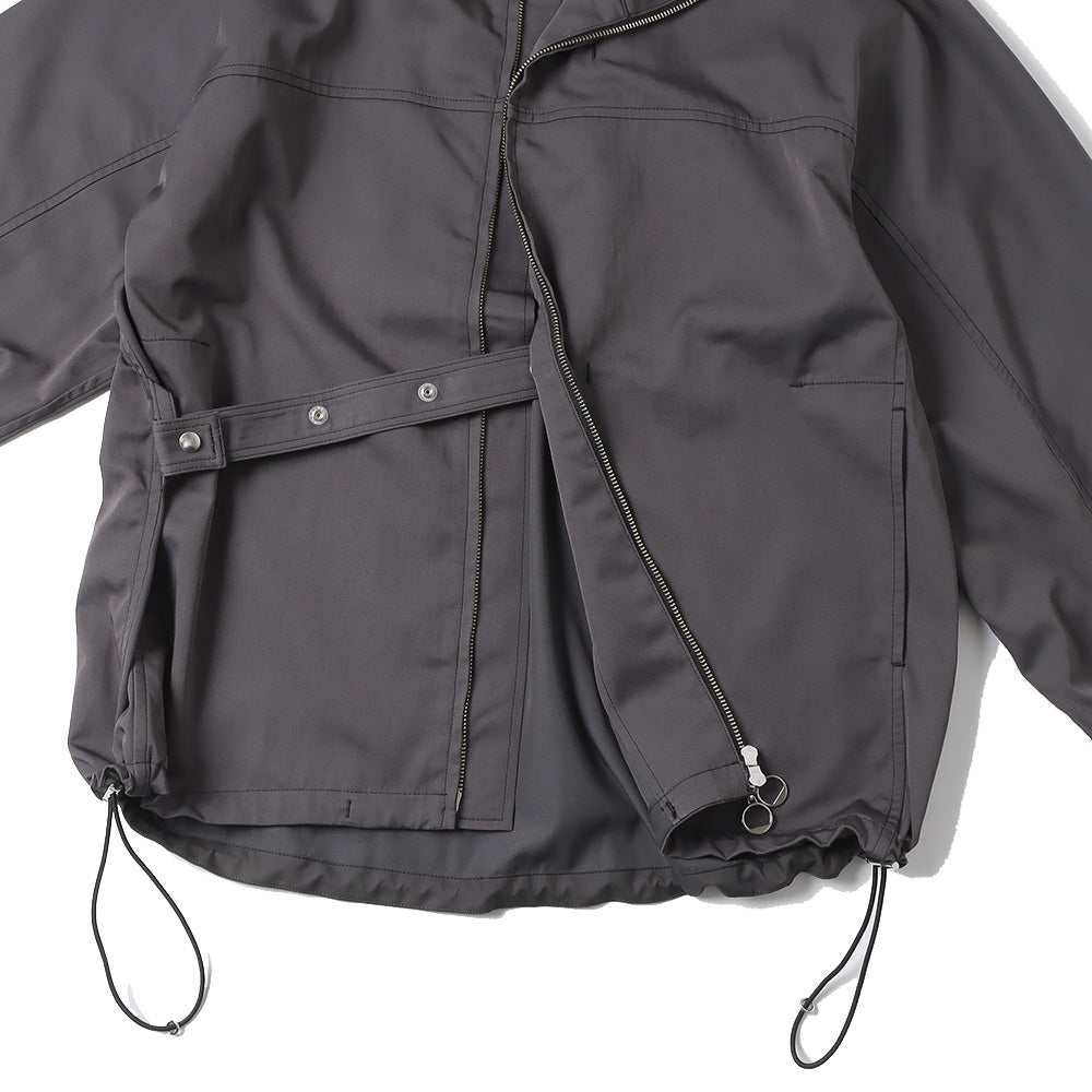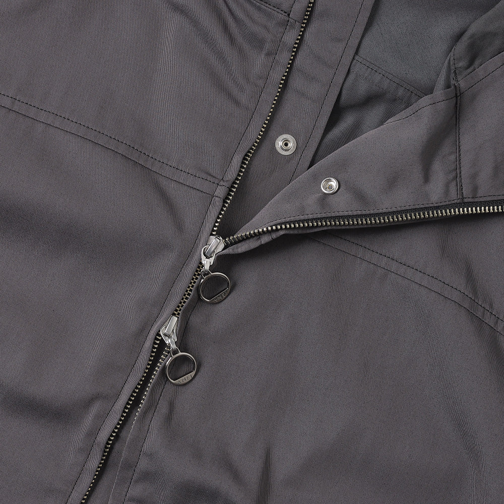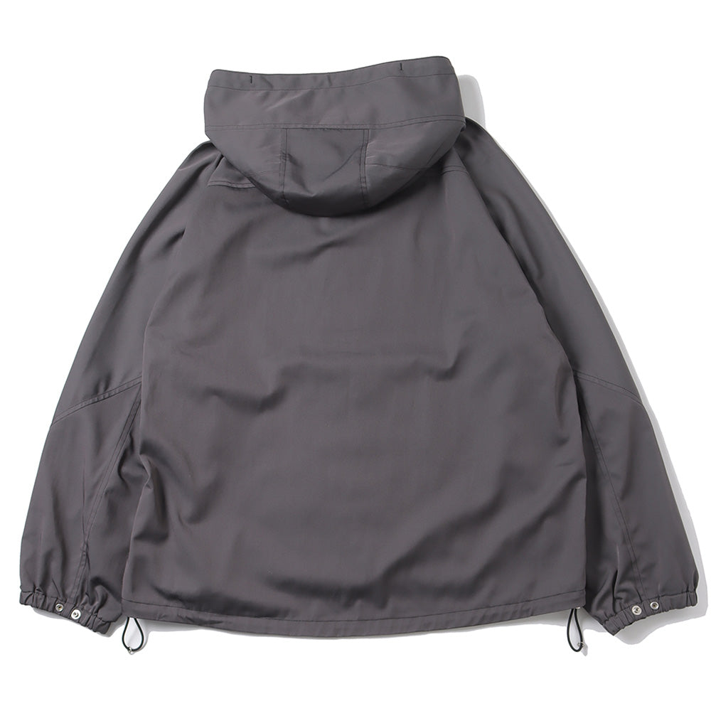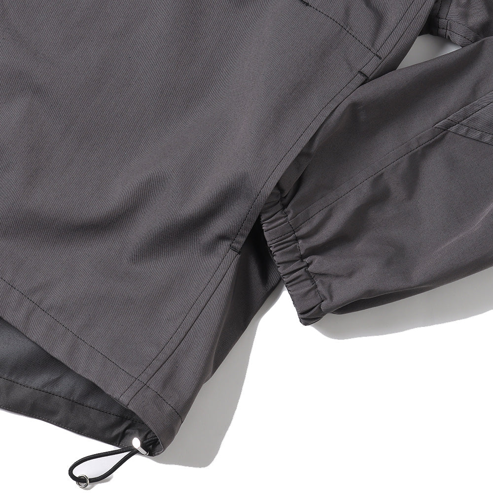 立体的な構造のフード、ソリッドなデザインに重厚感のあるメタルパーツが特徴。フード、裾にはスピンドルにて調整可能です。付属パーツをブラック、シルバーに統一し、デザインアクセントにしております。