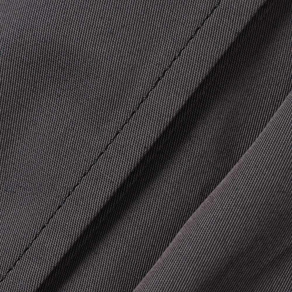ヘンプ特有の不均一な糸形状にコットンの自然なムラ感、特殊加工したポリエステルの光沢と強度を組み合わせた高密度綾織物。化学繊維、天然繊維それぞれ異なる色で染め上げており奥行きのある色味も特徴的です。撥水性がありドライタッチな風合いです。