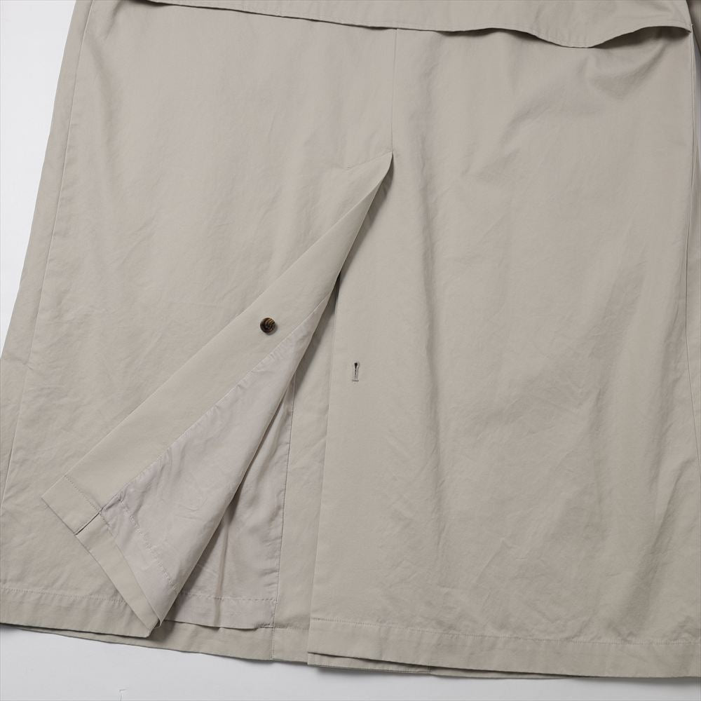 秋冬シーズンに展開していたモデルをベースにしたラグランスリーブコート。ざっくりと羽織れるサイズ感が特徴で、ボリュームのあるインナーの上からでもスムーズな着心地を実現しています。脇下にもゆとりをもたせた仕立てで、スタイリングの幅を広げています。膝下までのロング丈に、背面に配した大きなヨークが、動きに合わせて美しいドレープを演出。袖口のタブを絞ることで立体感が生まれ、現代的な表情に仕上げています。襟元にはボタンとボタンホールを備え、衿を立てた着こなしも可能です。