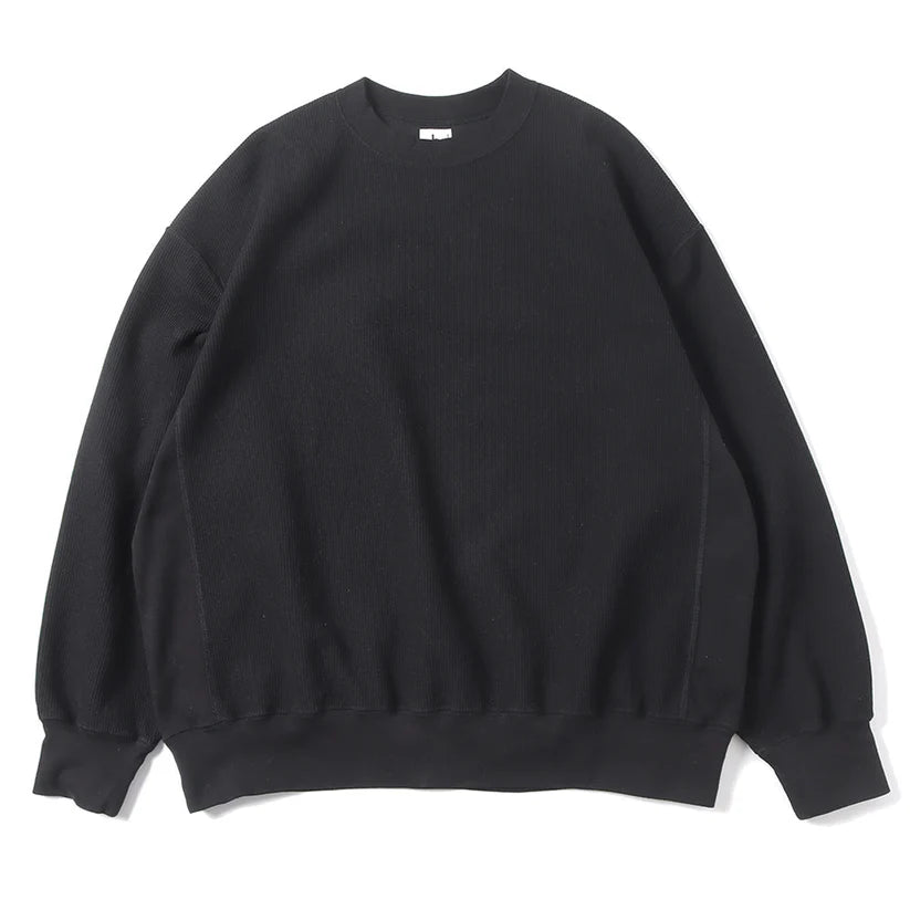 表面はワッフルのように凹凸がありますが、裏面はフラットに編まれています。そのため着用時の着心地が良く、着用後の伸びやへたりを軽減し、型崩れの少ない生地に仕上げています。吸水性と拡散性、ドライ感を生み出すポリエステル糸と硬く毛羽を取り除いた綿を合わせて使用することで、上品な光沢が表に出て、なおかつ吸水速乾性の高機能を持ち合わせた素材です。