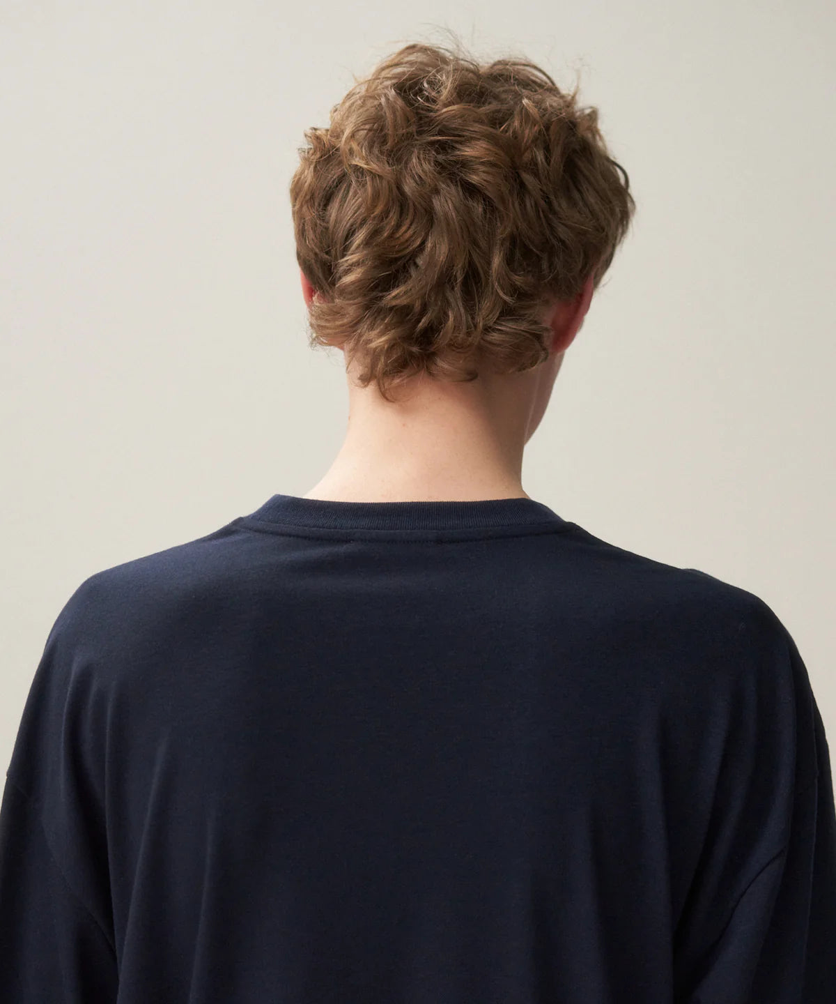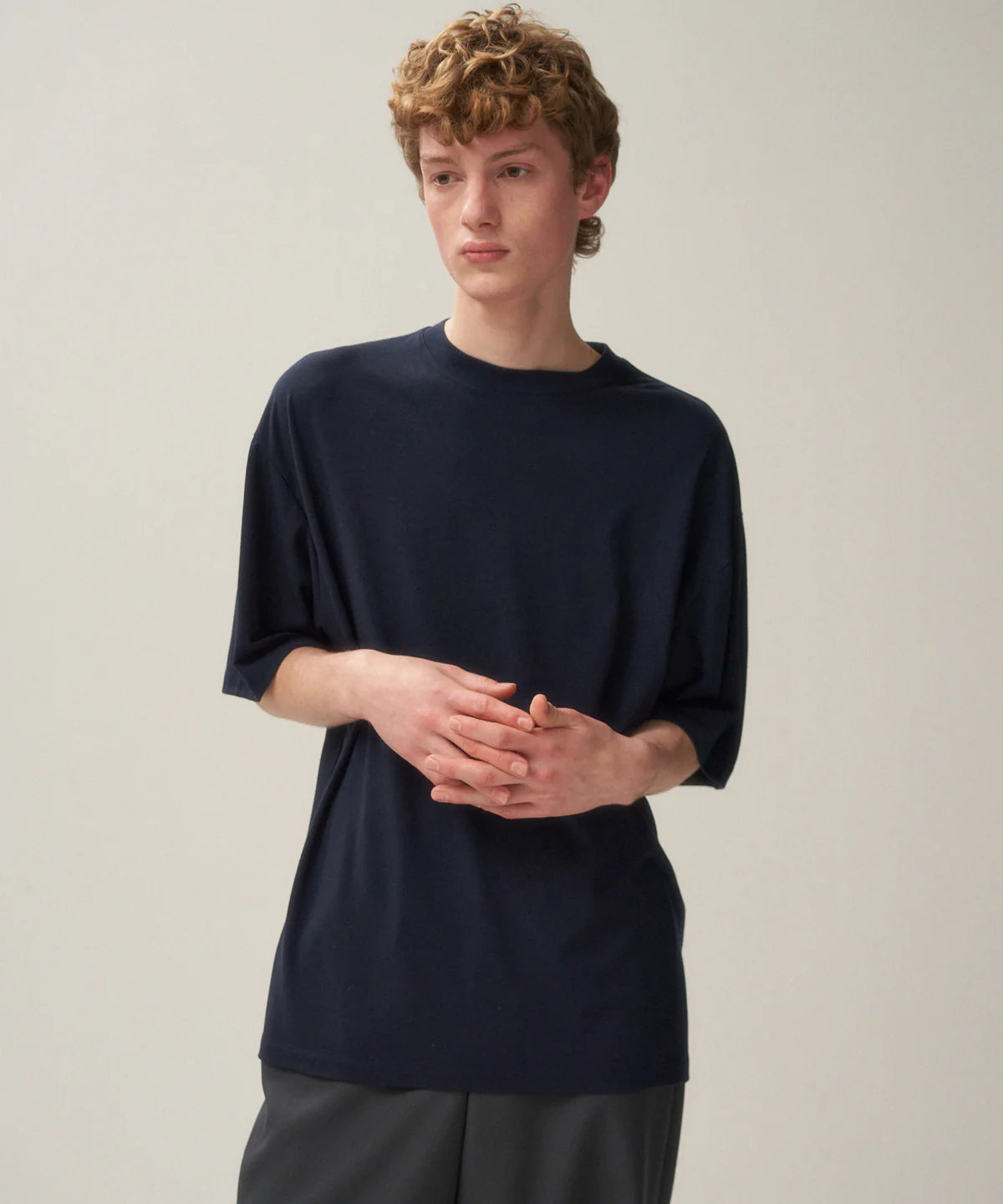 ボックス型のオーバーサイズシルエットが特徴の定番のTシャツです。首元はフライスでしっかりとつまっており、すっきりとした印象です。