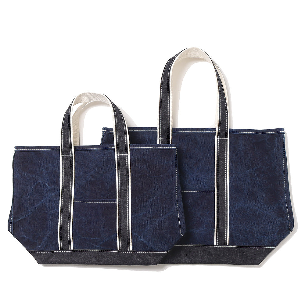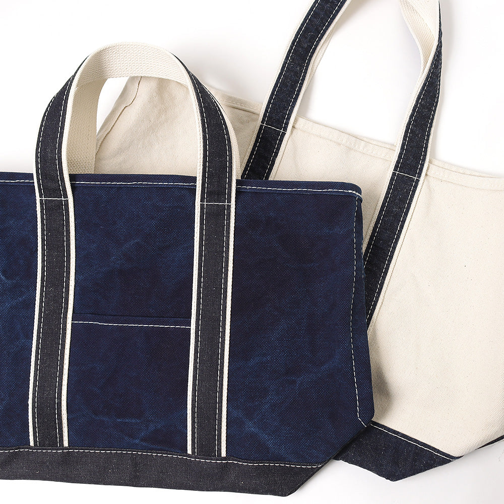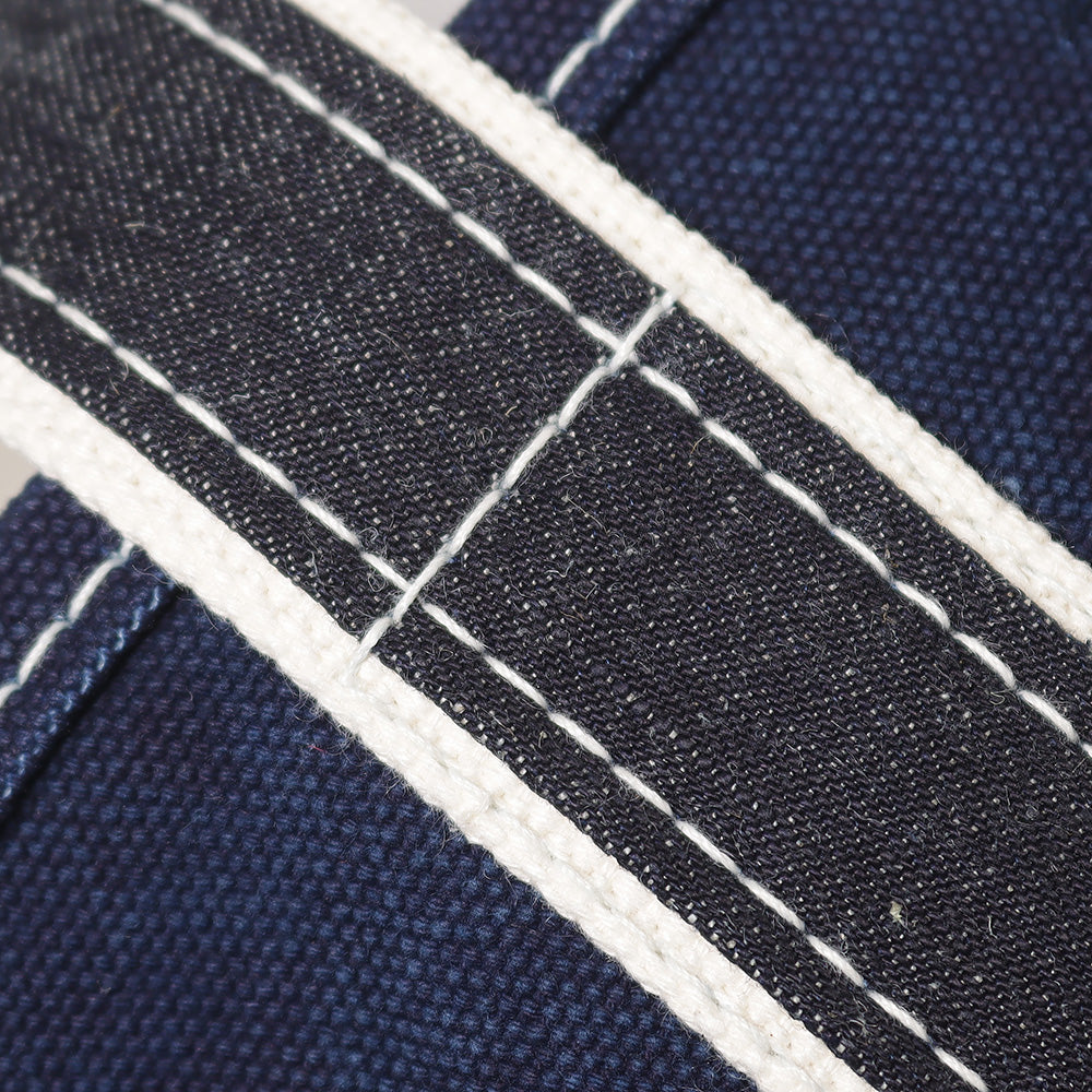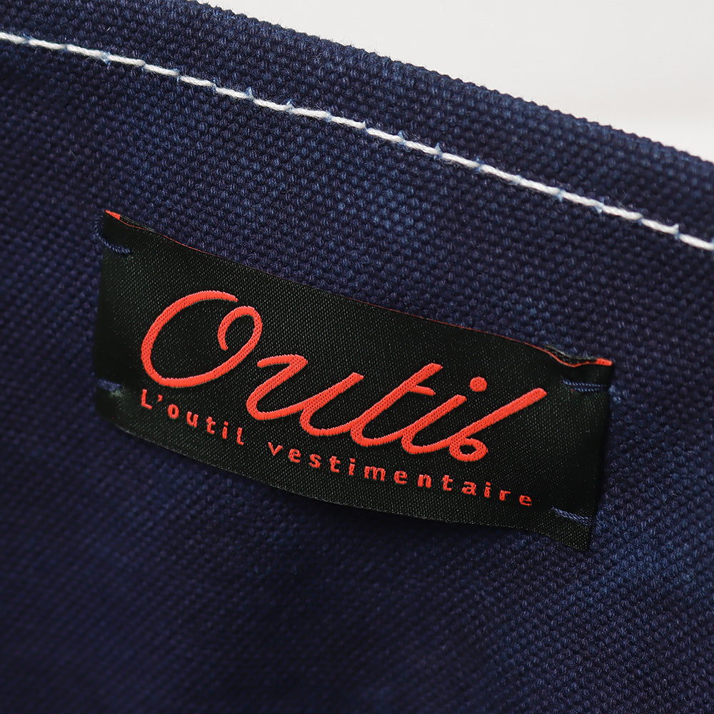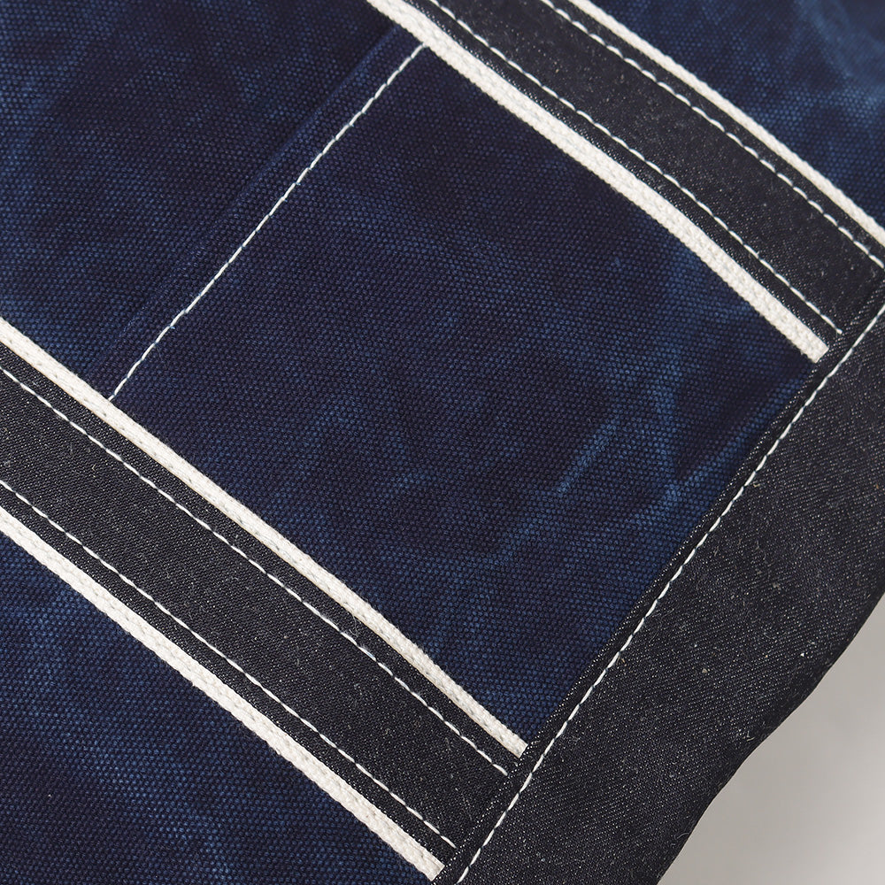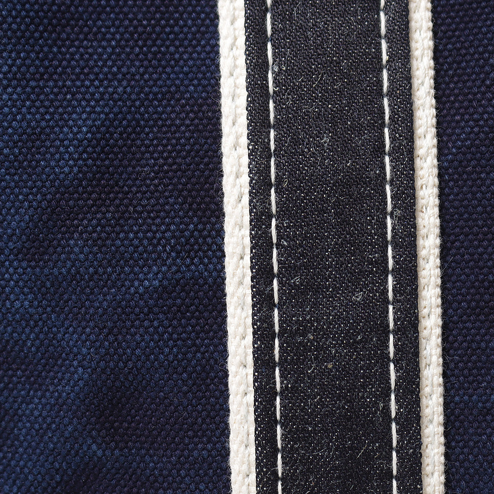 ベースの4号帆布を手染めでインディゴ染を施し、outil素材とコンビで。
