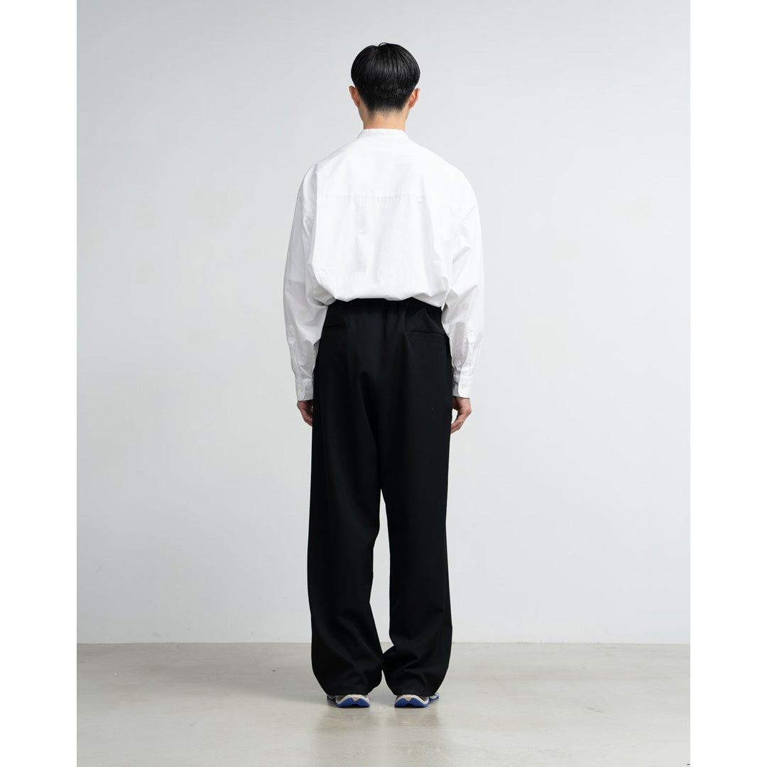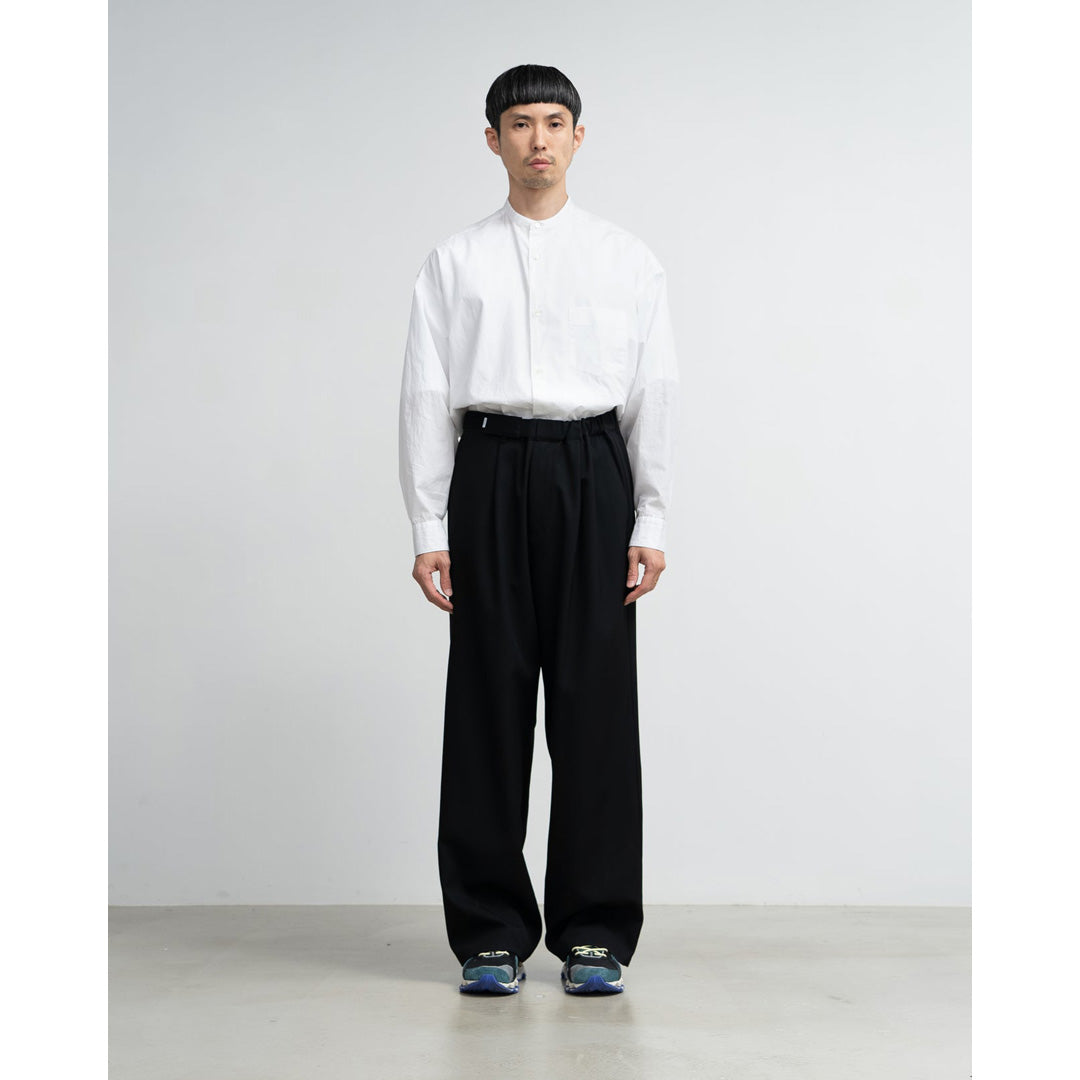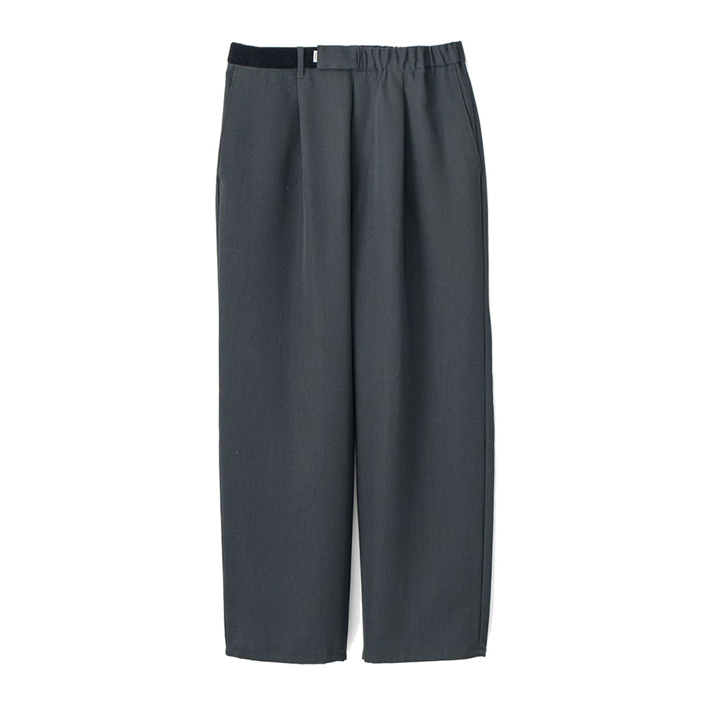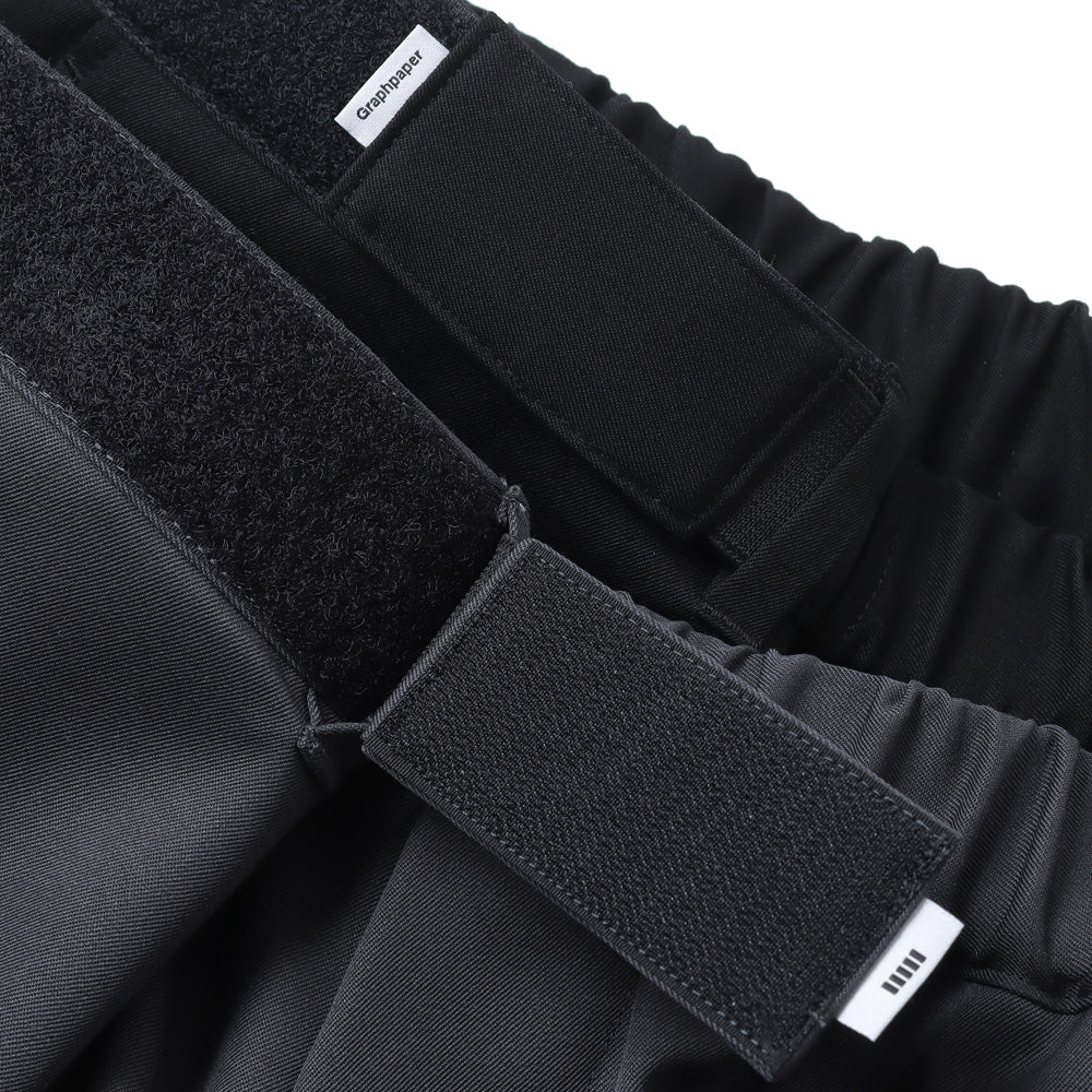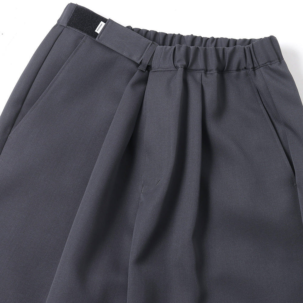 縦糸と横糸のバランスに徹底的にこだわり製作したウールギャバジンは美しい綾目と程良いハリ感、しなやかなドレープ感が特徴。特殊な樹脂をウール繊維の内部まで染み込ませることでフィラメントのような光沢とクリアな質感に仕上げている。ウエストのサイズを簡単に調整できてシルエットもアレンジできるGraphpaper定番のシェフパンツ。深めの股上でボリュームのあるワイドシルエット。