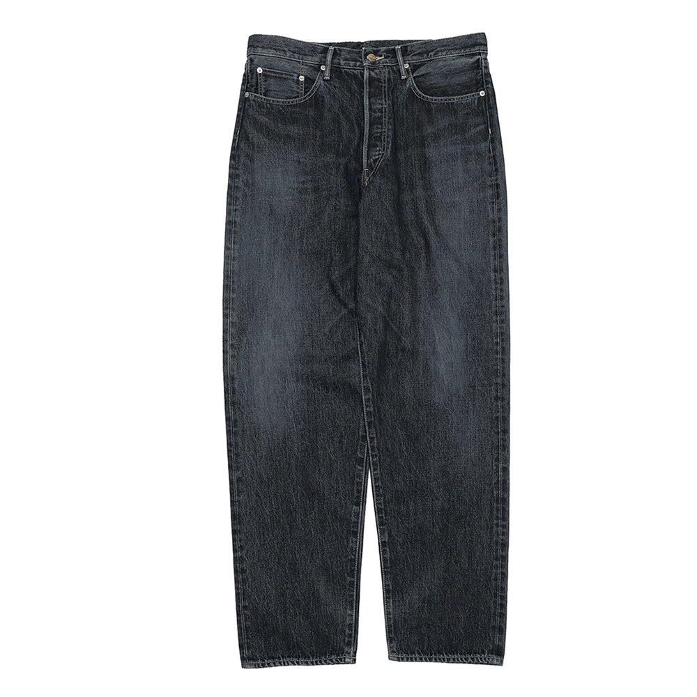 130年もの歴史を誇る米国Cone Denim社が作る13.75オンスのセルビッチデニム。今シーズンよりブラックデニムが仲間入り。旧式力織機でゆっくりと織り上げることで生まれる、生地表面のざらっとした凹凸やムラがデニム本来の風合いを感じさせる魅力的な素材。ゆったりとした腿回りから、裾にかけて緩やかにテーパードさせたリラックスフィットのファイブポケットパンツ。ロゴの刻印入りのタックボタンを配し、クリーンなヌメ革のパッチがウエストを飾る。メリハリのある濃淡が特徴のダークフェイド。