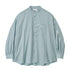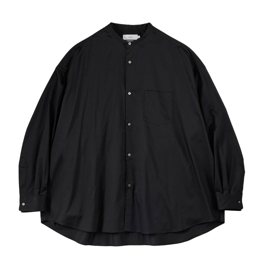 超長綿で織りあげた平織り生地にシリコンを原料にした特殊樹脂を含浸することで生地に反発感とハリ感を持たせ、さらにバイオ加工を合わせることで滑らかで柔らかい風合いを表現した素材。綿100%と思えないシルクのような質感が特徴。 ドロップショルダーでボリュームのあるボックスシルエットのバンドカラー。肩の傾斜や低く下げられたヨークの位置、アームホールの広さなど、細かなディテールを特異なバランスで仕上げたビッグシルエット。