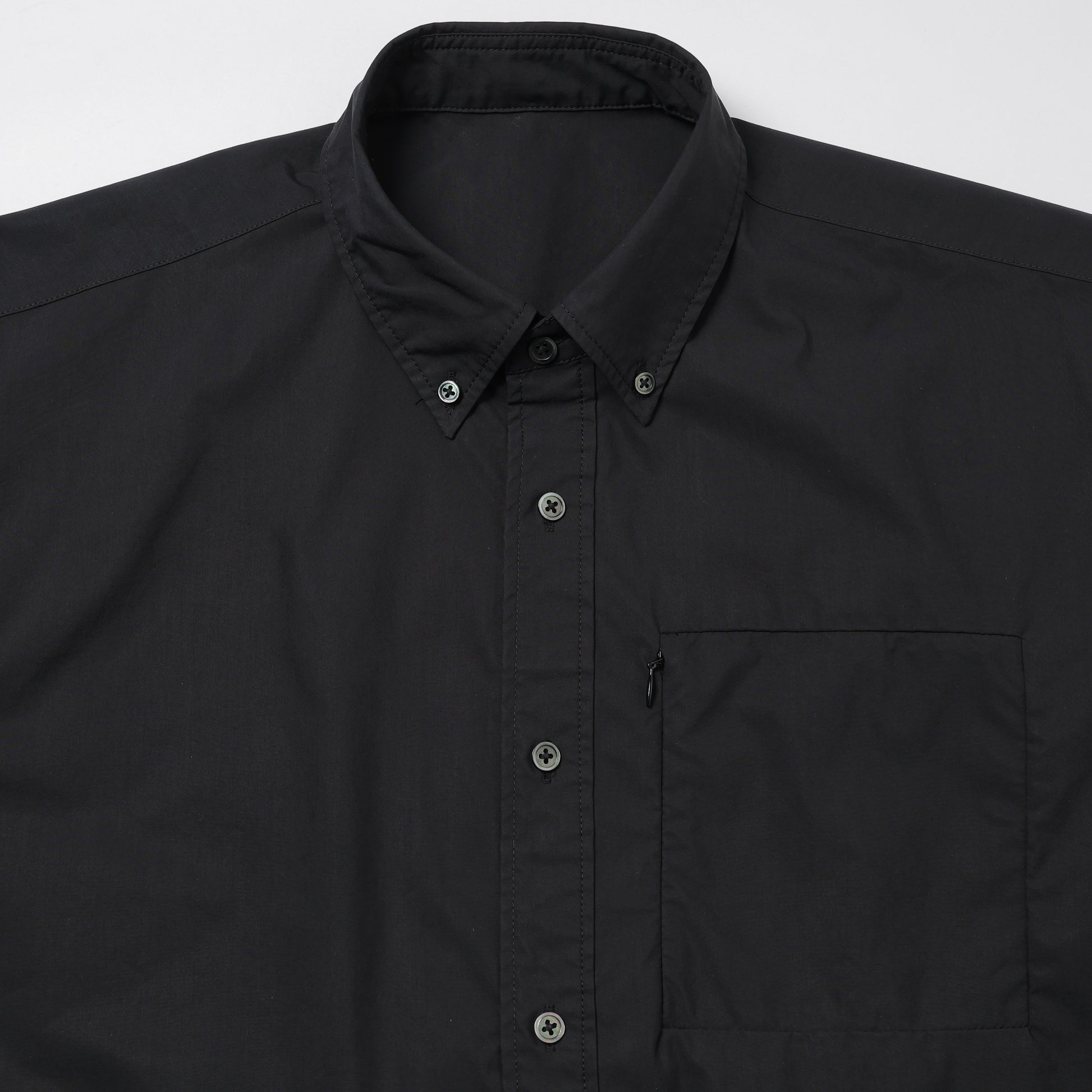 ドロップショルダーのゆったりとしたシルエットが特徴のボタンダウンシャツ。今期は生地をSOLOTEX®タイプライターにアップデートし、従来の綿素材に見られた経年劣化やシワの課題を解消。SOLOTEX®特有の優れた伸縮性と形態回復性により、型崩れしにくく快適な着心地を実現した。しなやかな風合いを備え、左胸のコンシールファスナーポケットや脇の大容量ポケットなど、ミニマルなデザインの中に実用性を落とし込んでいる。洗練されたルックスと実用性を兼ね備えた一枚。