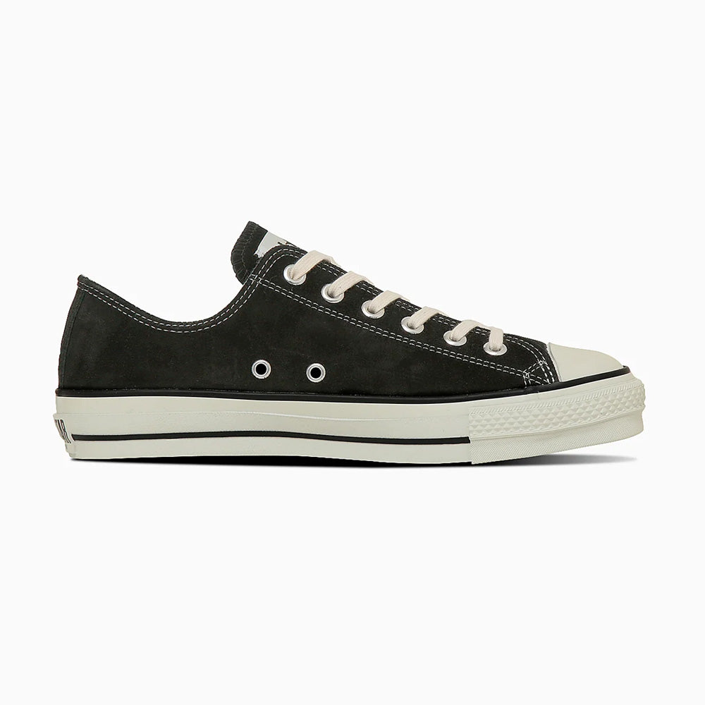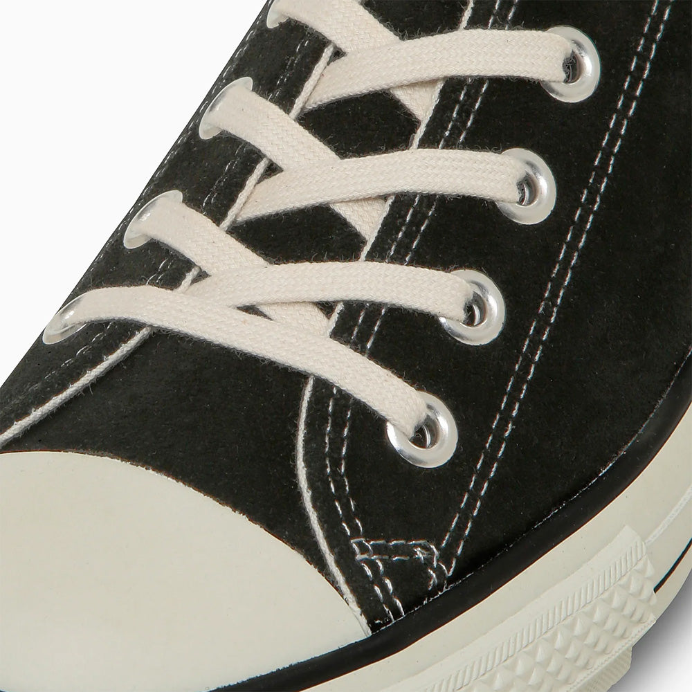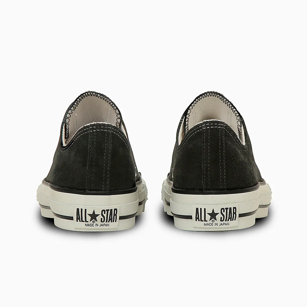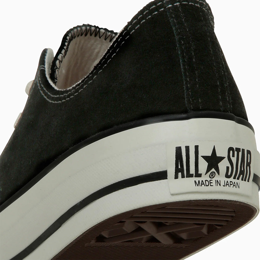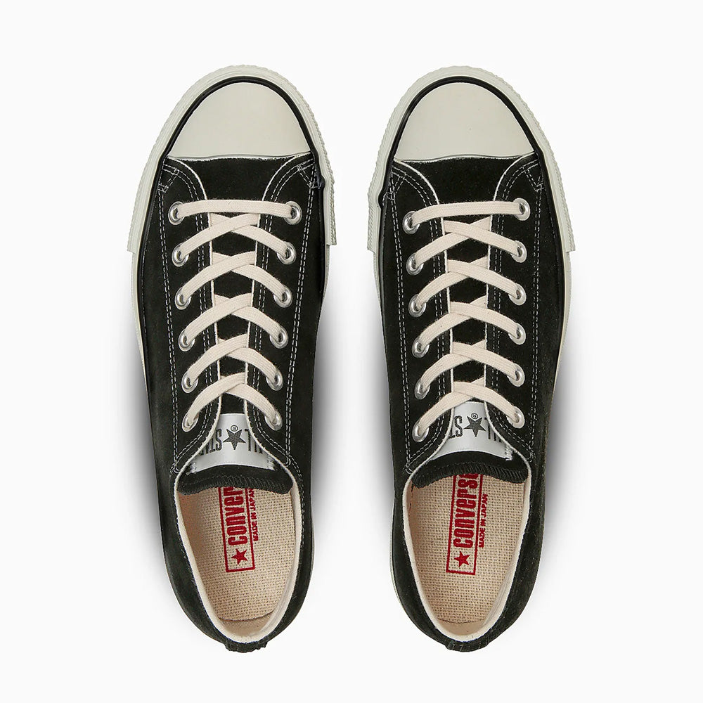 ヒールラベルの下部に印字した「MADE IN JAPAN」の文字、日本国旗をイメージして赤字で印したインソールのコンバースロゴがポイント。