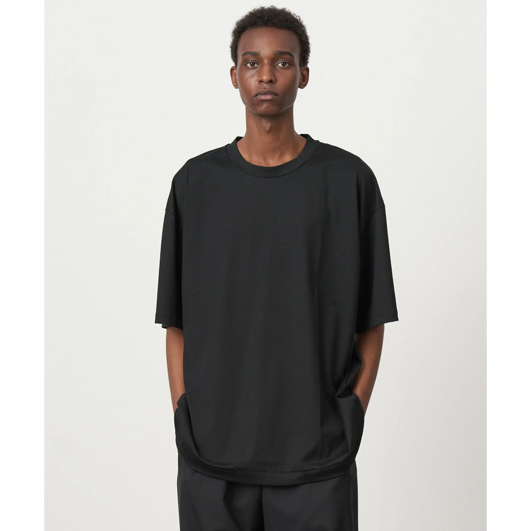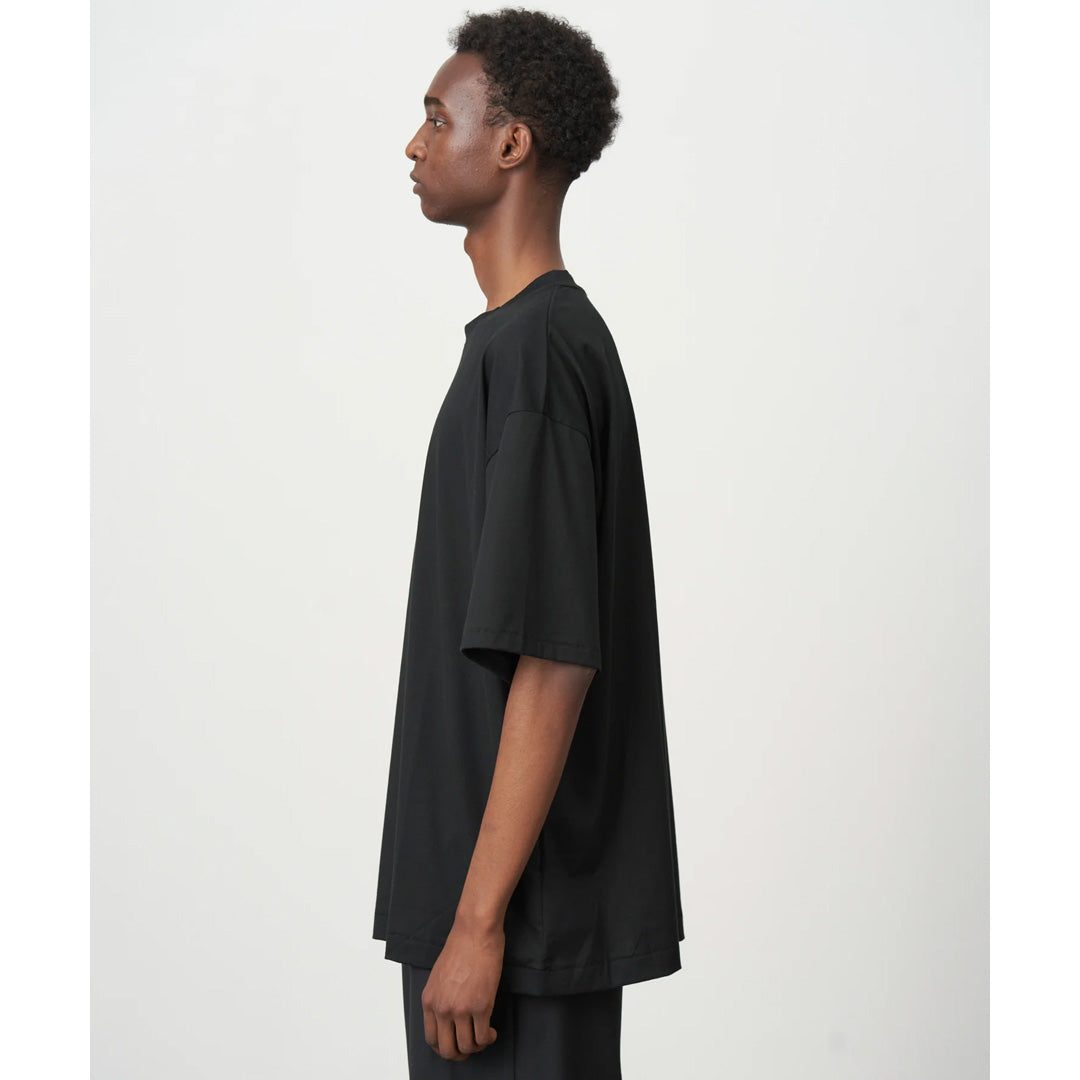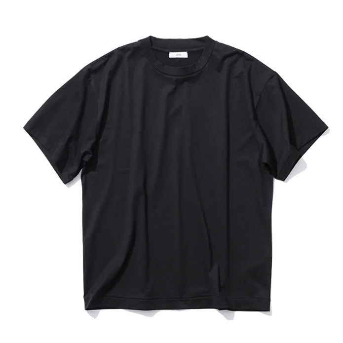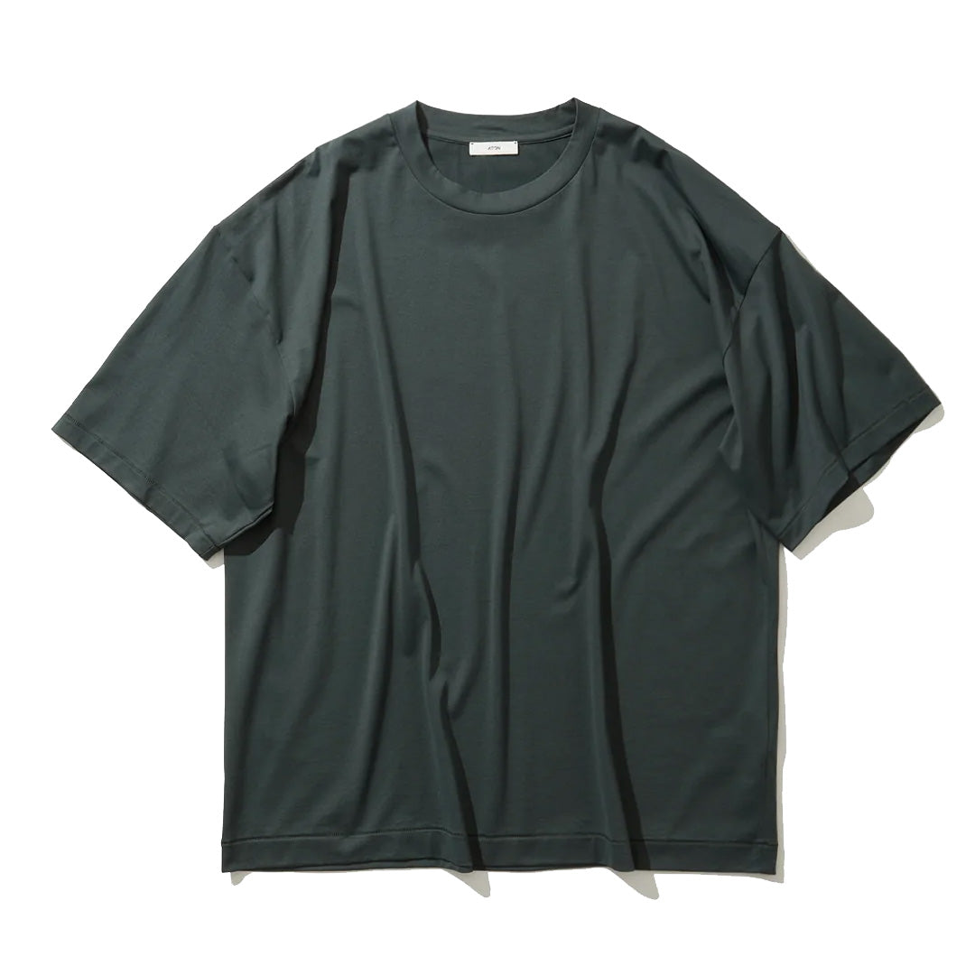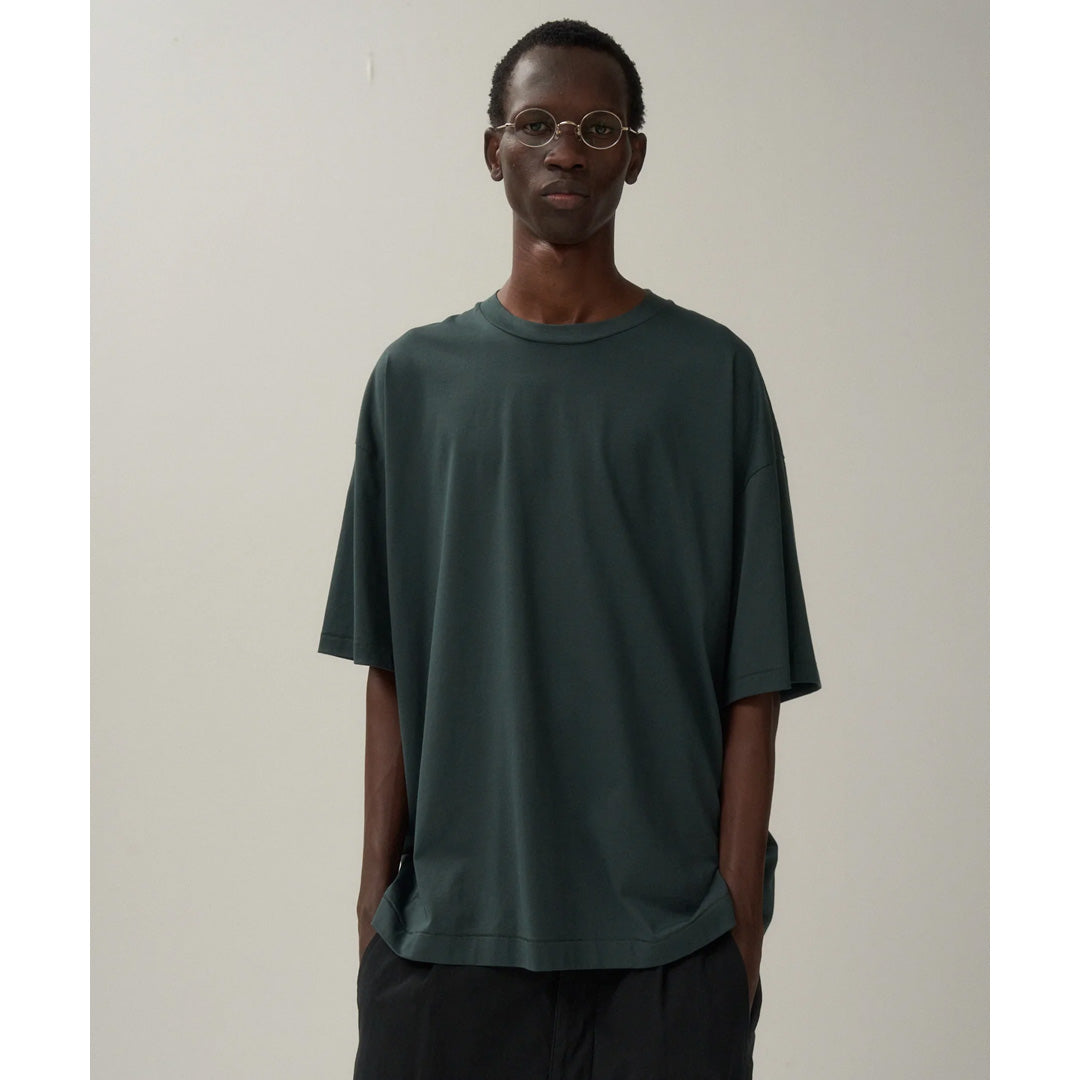 身幅に対し、着丈が少し長めのオーバーサイズシルエットが特徴のTシャツです。素材に落ち感があり、艶のある上品な表情が特徴です。男性サイズを女性が来てもさまになります。