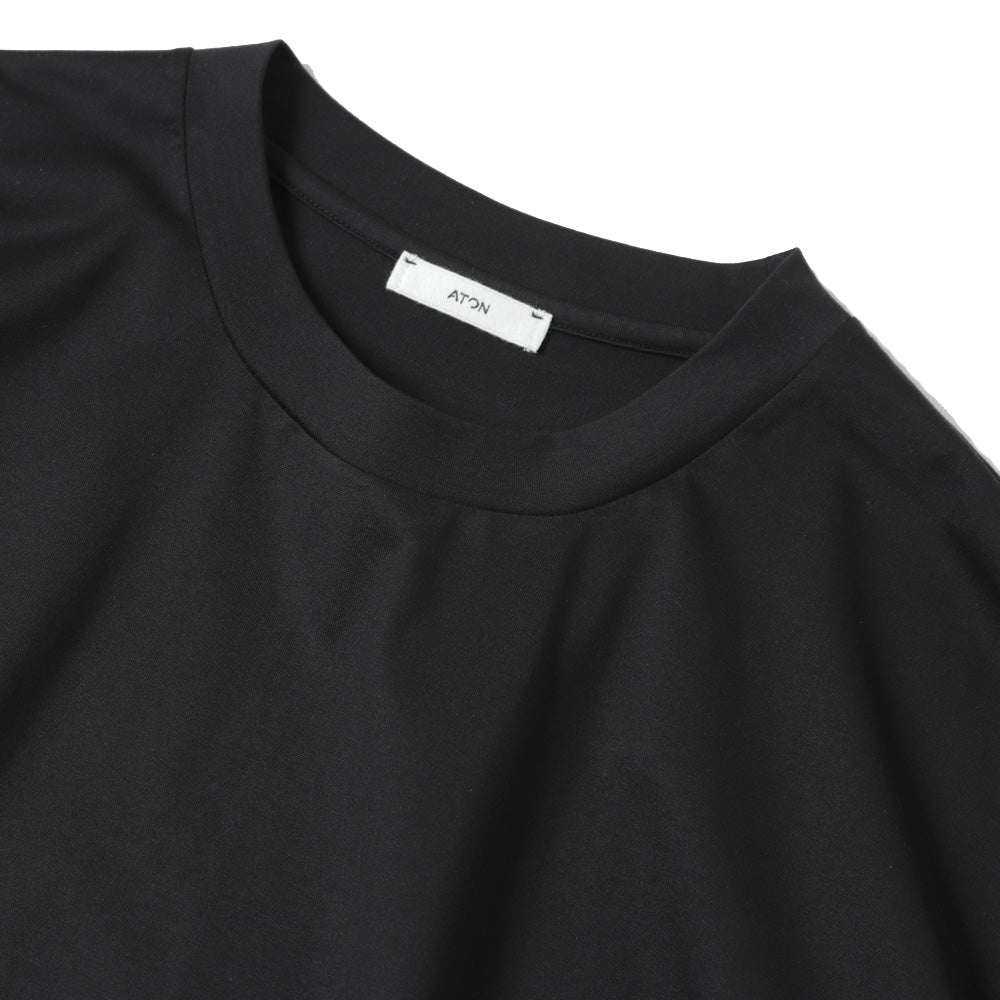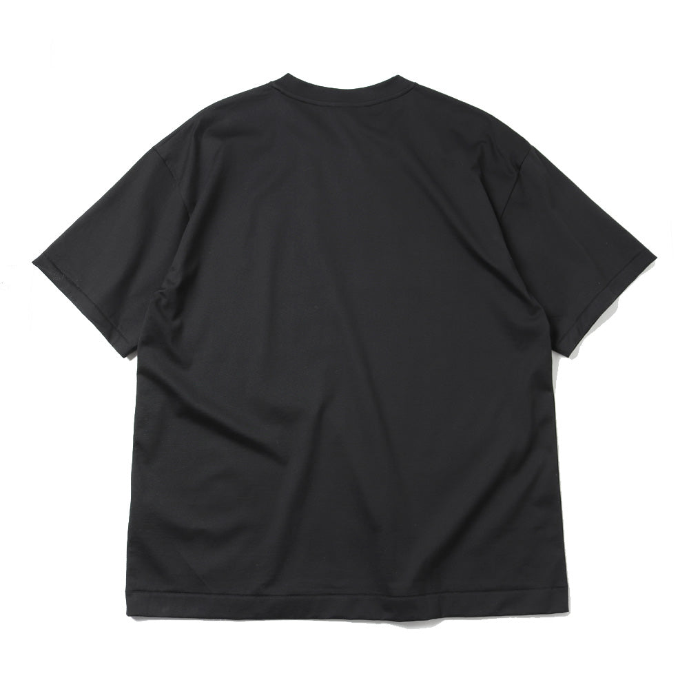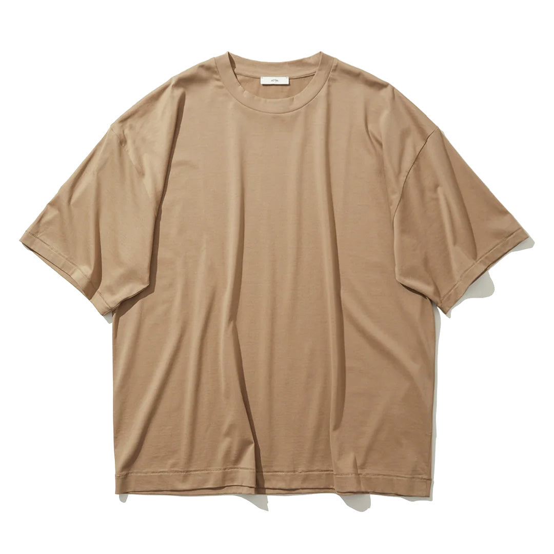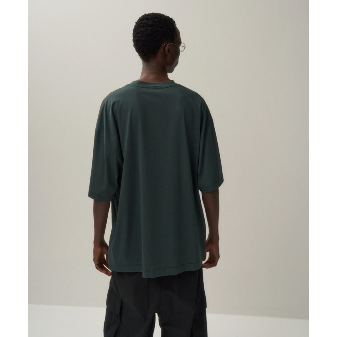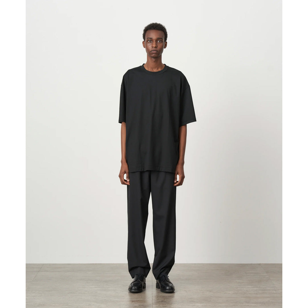 身幅に対し、着丈が少し長めのオーバーサイズシルエットが特徴のTシャツです。素材に落ち感があり、艶のある上品な表情が特徴です。男性サイズを女性が来てもさまになります。