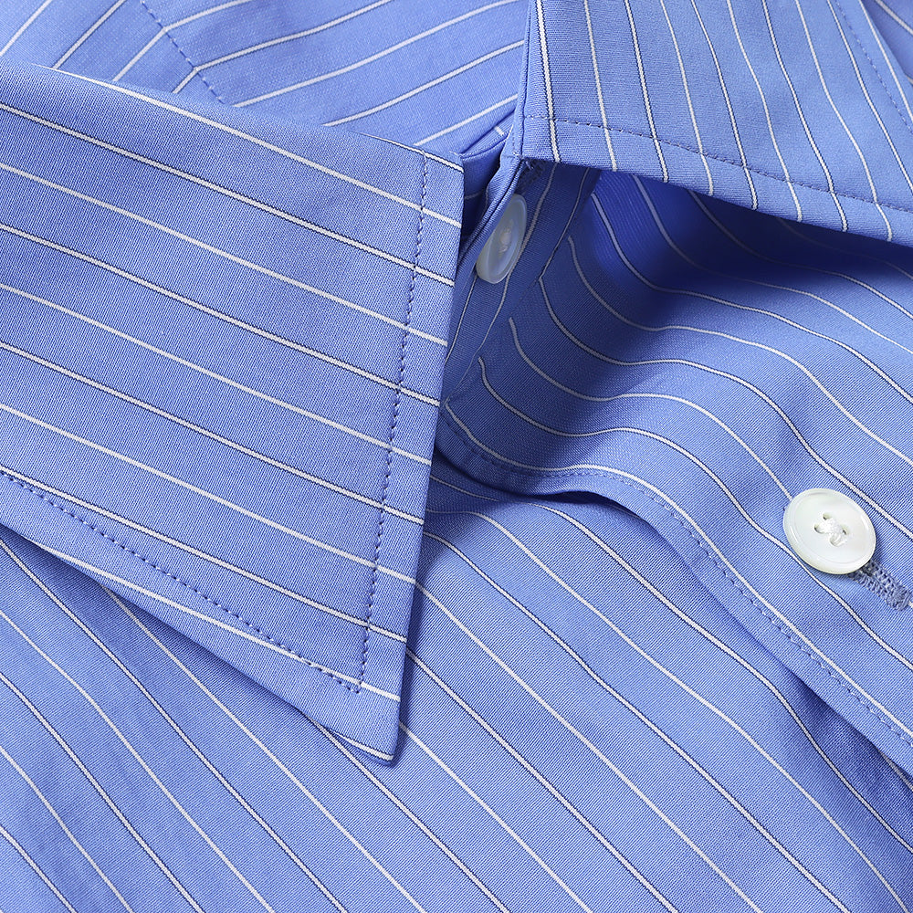 極細番手のSUVIN COTTON 100%を使用し、紡績時にガス焼き工程を経て1本1本を美しい糸に仕上げ、丁寧に織り上げたストライプ柄のブロード素材です。自然でナチュラルな風合いを大切にし、クリアで滑らかな生地に仕上げました。