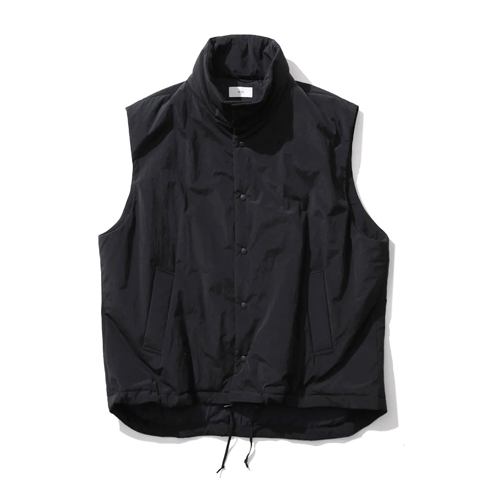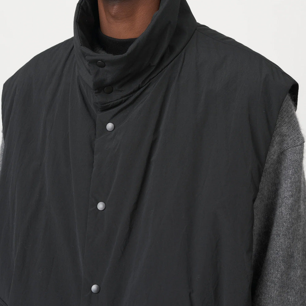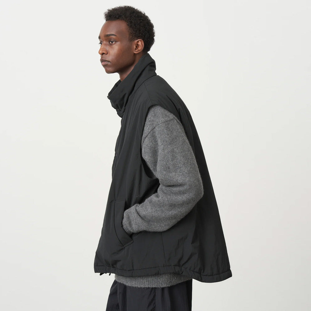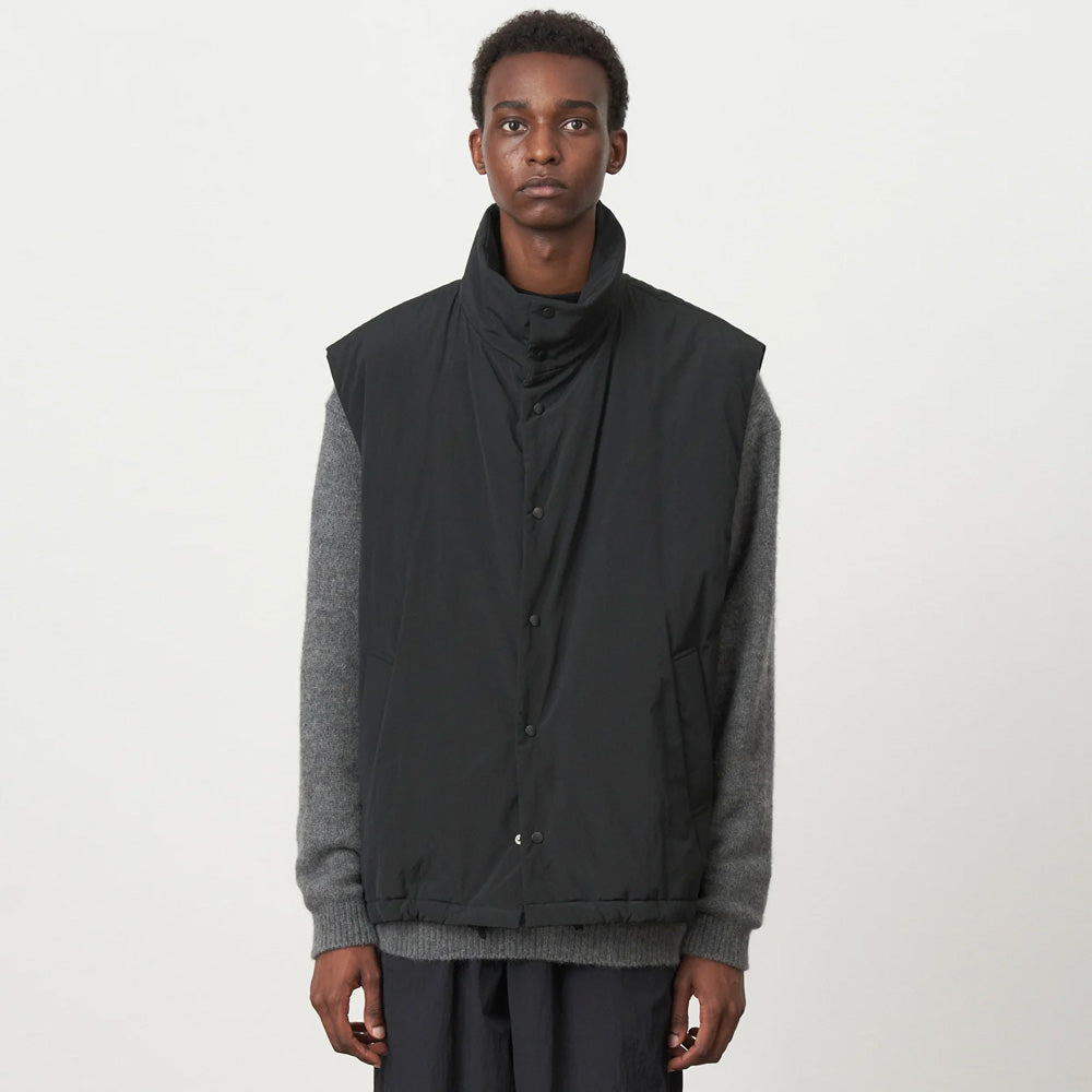 古着のスタンドカラーベストをベースに、サイズをそのまま大きくして作成したオーバーサイズなシルエットに仕上げました。ゆったりとラウンドした裾や、大きくとられた丸みのある後ろ身頃が特徴的です。80gの中肉のリサイクル中綿を使用しています。裏地には、防風性の高いナイロン素材を使用することで、保温性がありながら立体的なシルエットを作り出します。