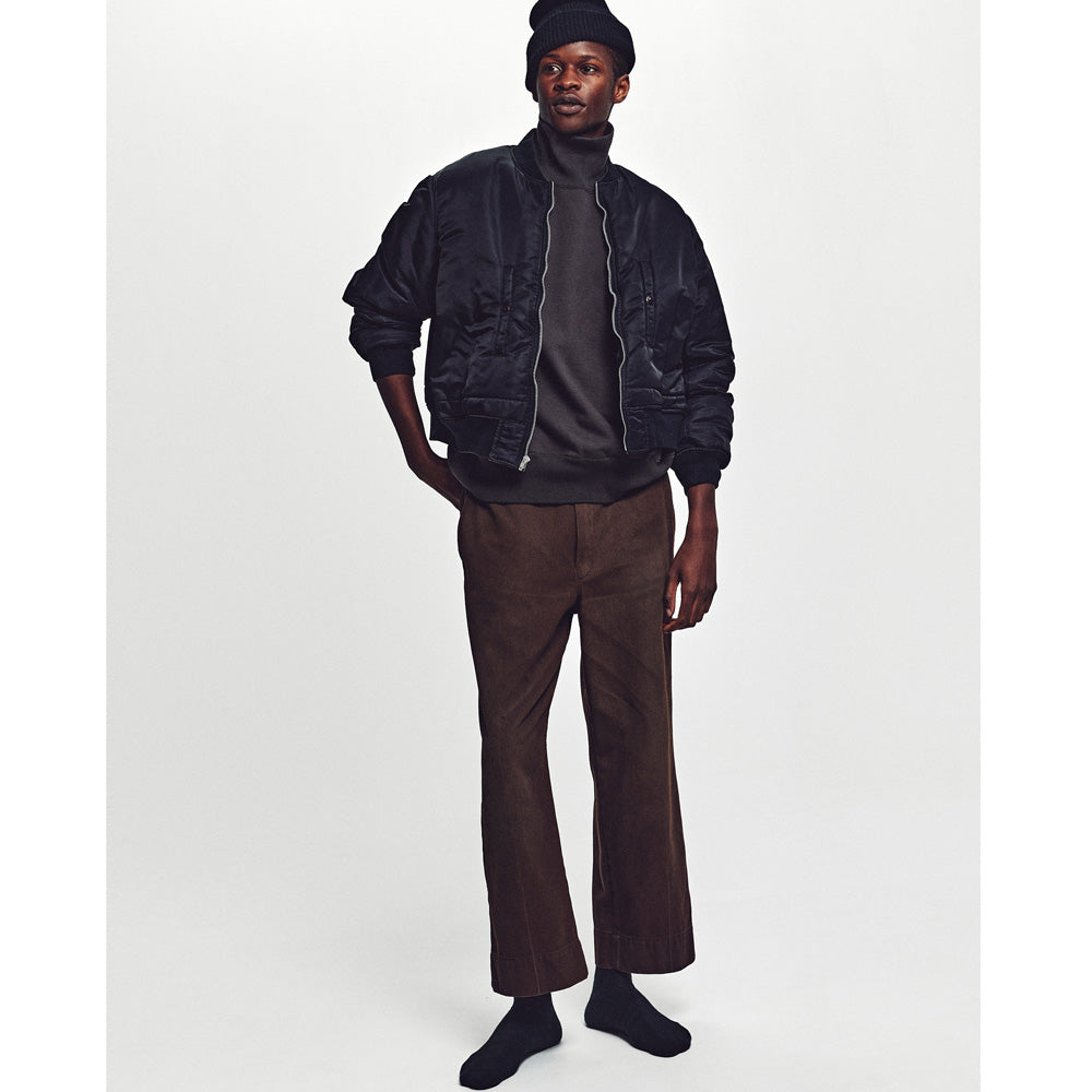 ヴィンテージMA-1特有の着古したようなサイズ感を再現するため、身幅を大きく、着丈は短くデザイン。