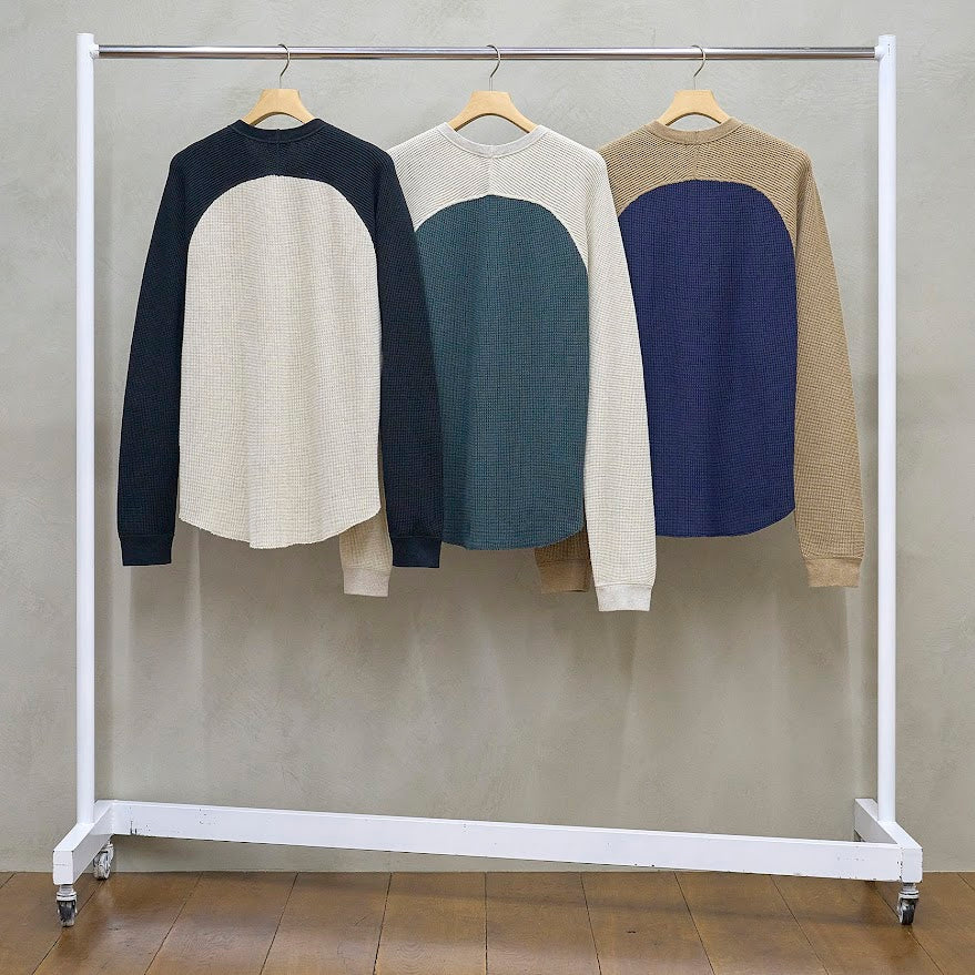 粗野な表面感が特徴で、さらっとした着心地のワッフル生地になります。