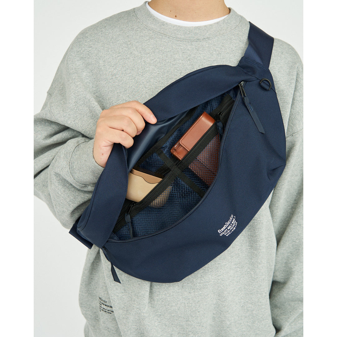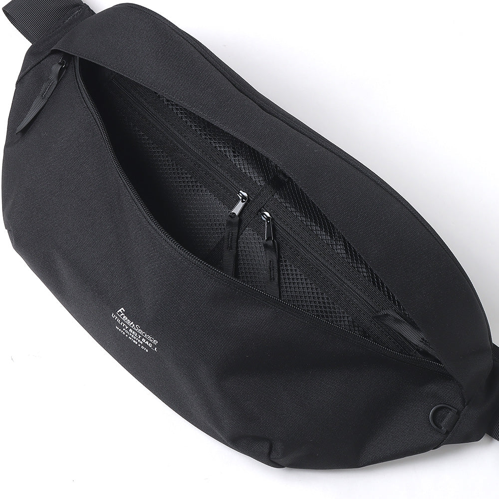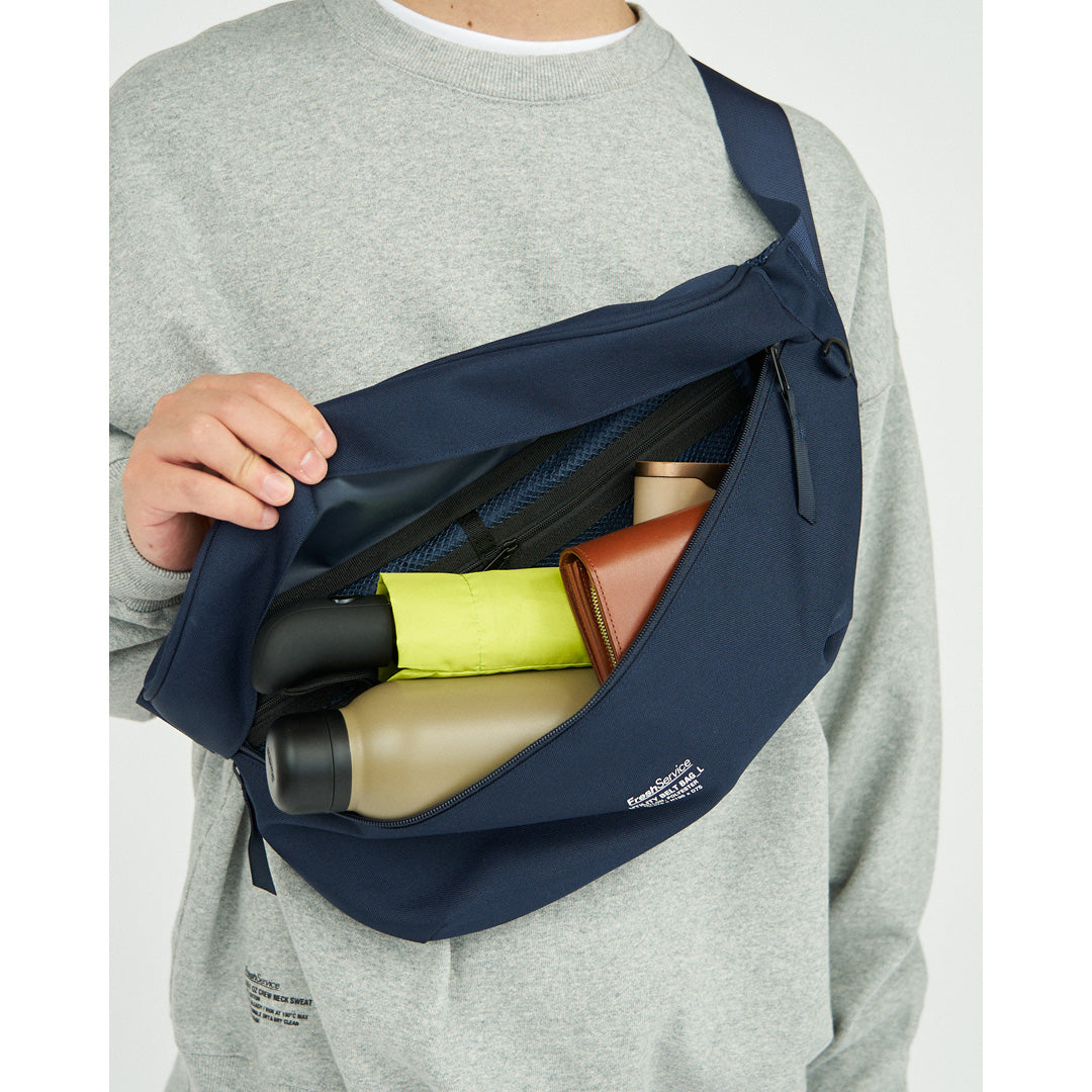 FreshServiceオリジナルのベルトバッグ。収納力抜群のファスナーつきメインコンパートメントに加え、内側と裏面にもファスナーポケットを配備した充実の収納力が魅力。体と接地する背面には蒸れを防ぐパッド入りメッシュ素材を。ショルダーベルトを調整するバックルは2分割が可能な為、かさ張る上着の着用時でも容易に着脱が可能。