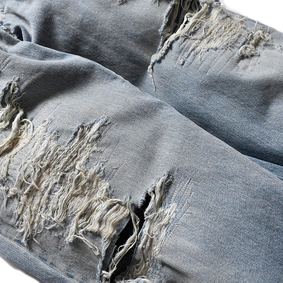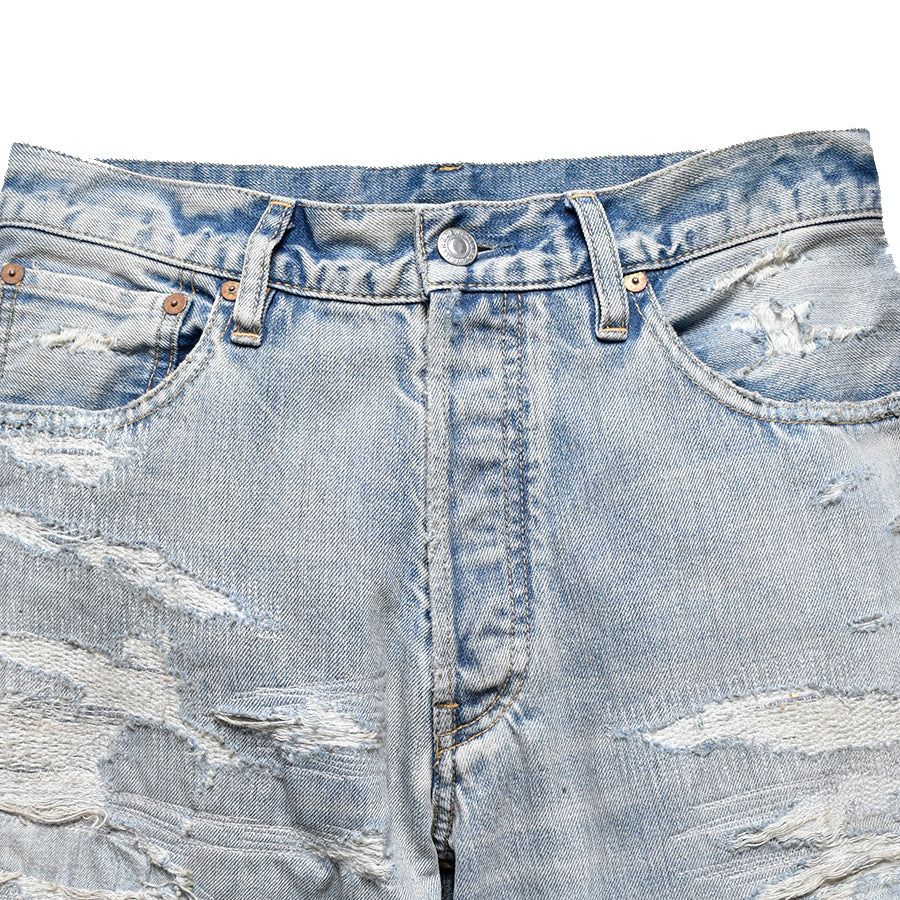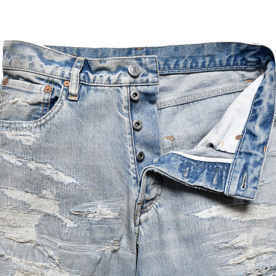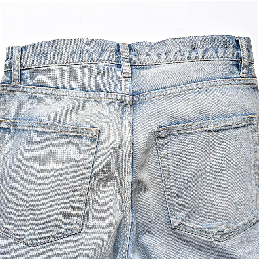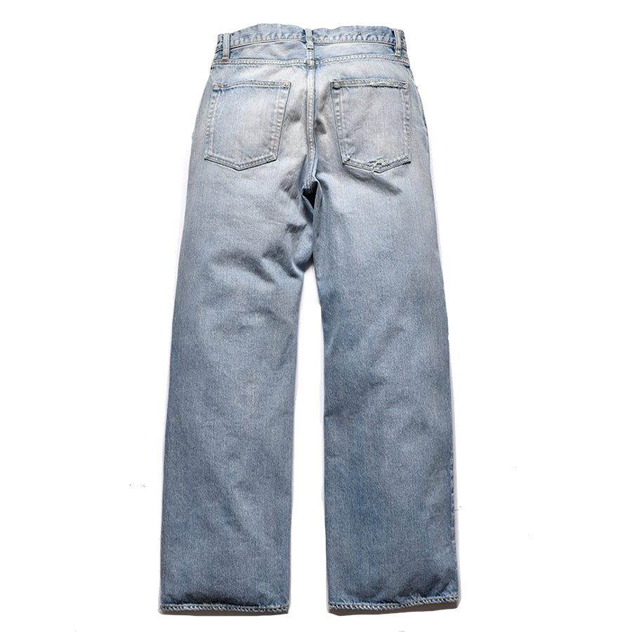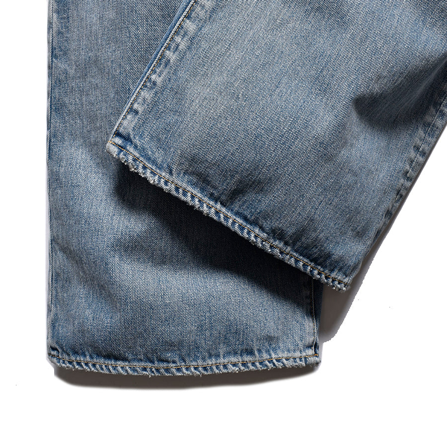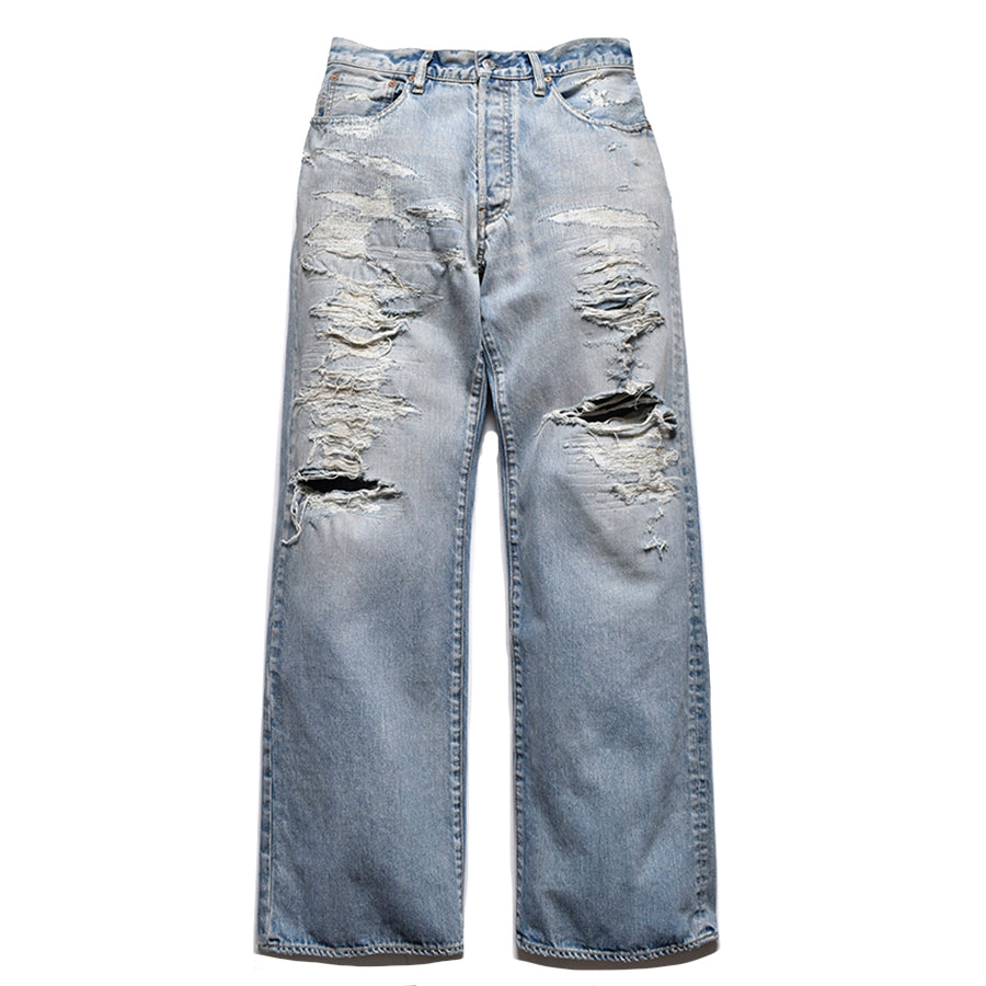 MINEDENIMのシグニチャープロダクトであるスタンダードジーンズシリーズの中から(FPK106) Wide Straightをベースにしたシーズナルデザイン。ライトブルーまで色落ちさせたベースウォッシュに加え、こだわりのダメージ&クラッシュ、そして丁寧なリペアを施して、ヴィンテージクオリティに仕上げたスペシャルなジーンズとなっております。