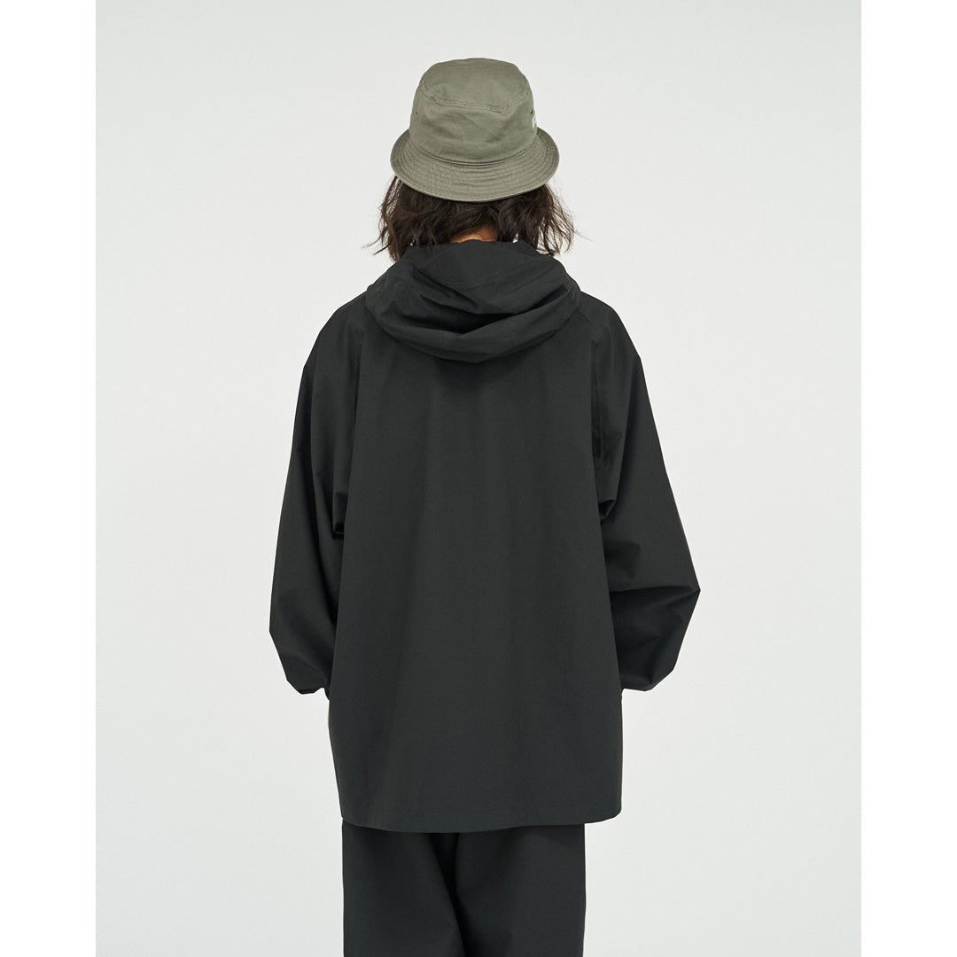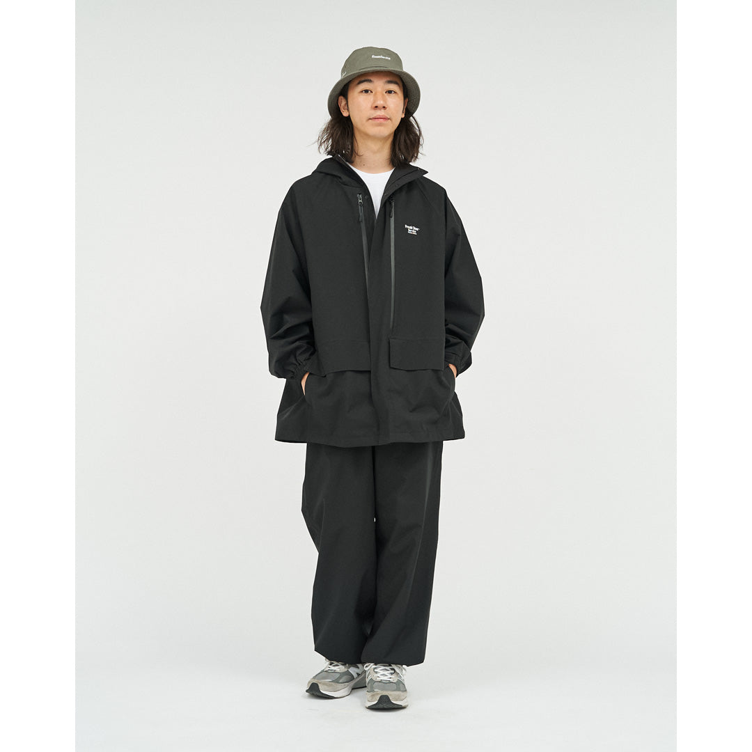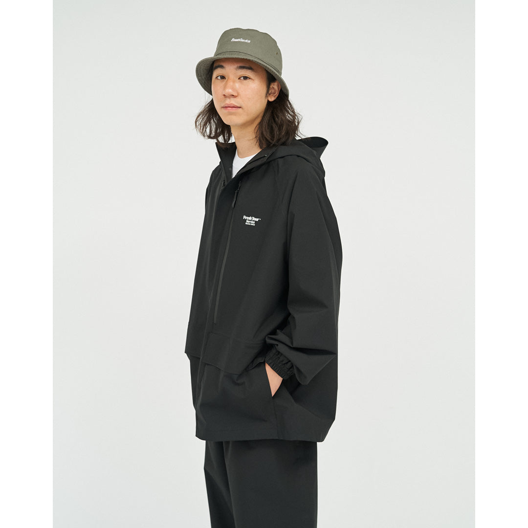 旅をテーマとしたFreshTourServiceからリリースされる、軽量で撥水、透湿性に優れたオリジナル3レイヤーファブリックを採用。オーバーサイズのフード付きシェルジャケット。フロントには縦型のフロントジッパーでアクセスできる内部ポケットシステムがあり、開けるとモバイルフォン、モバイルバッテリー、パスポート、タバコなどの旅行用品を安全に収納出来ます。