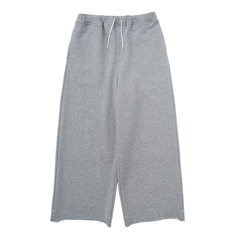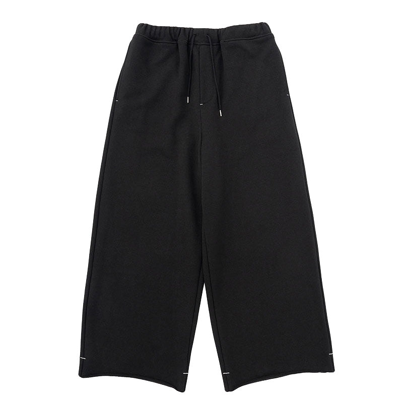 裾に特徴的にボリュームを持たせた断ち切りのワイドスウェットパンツ。 好みでレングスをカット調整できるよう、裾から少し上に配色でカンヌキを入れました。