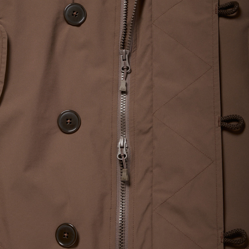 特徴的な風の侵入を防ぐ前立てのデザイン、フラップ付きハンドウォーマーはそのままに、また、ハンティングジャケットからインスピレーションを受けデザインしたフロントからサイドにかけて大きくデザインしたフラップポケットもDAIWA PIER39ならではのデザインです。