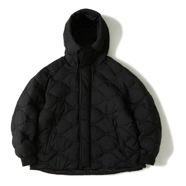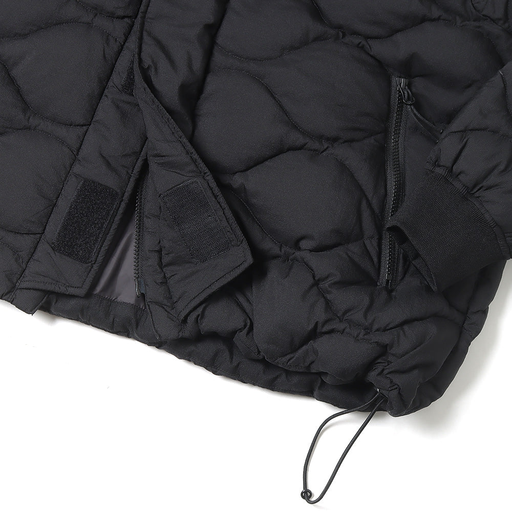 表面のヘチマキルト、幅広の前立て、フード周りのデザイン、袖口リブなどミリタリーアウターのディテールと雰囲気を醸し出すWM×TAIONラグランフーデットジャケット。20Dのマイクロリップストップ高密ナイロンにワッシャー加工と撥水加工を施したドライタッチな表面感と軽さが特徴の素材です。