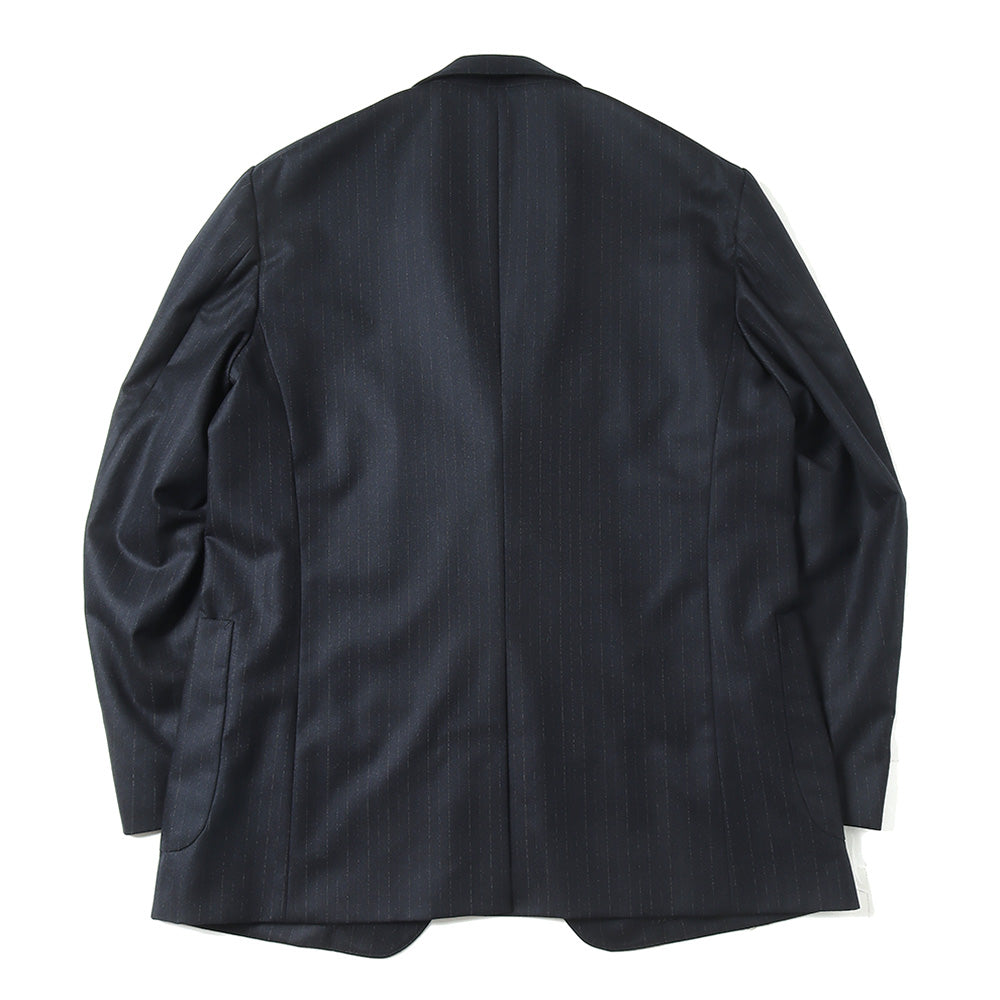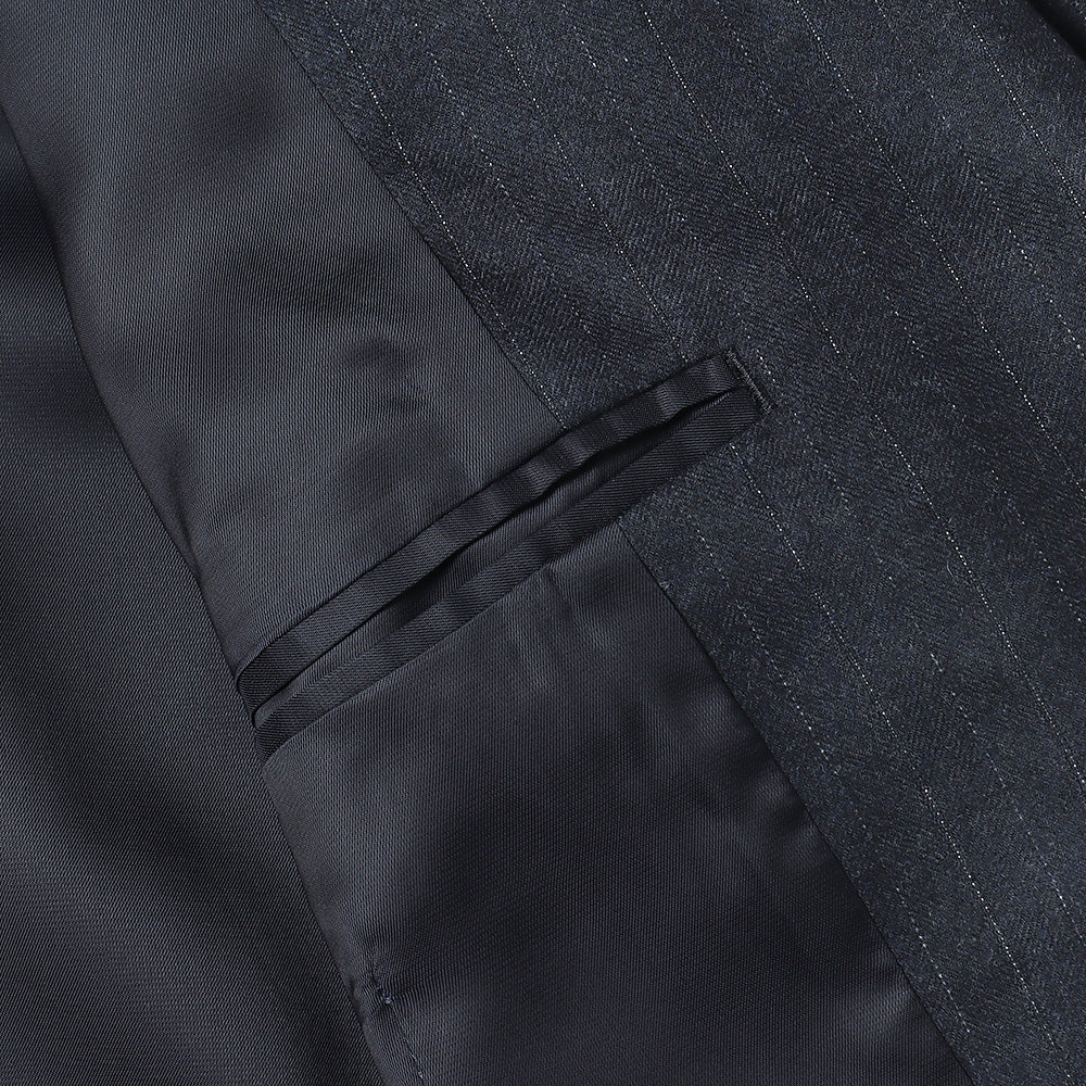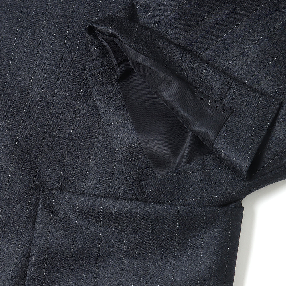 Super180'sの梳毛トップ糸を使用し、ヘリンボン組織の中にシルクを織り込んだストライプ柄素材です。時間をかけて縮絨させ、キメ細かく上質な光沢と滑らかな質感、そして杢糸の柔らかい色合いが特徴です。