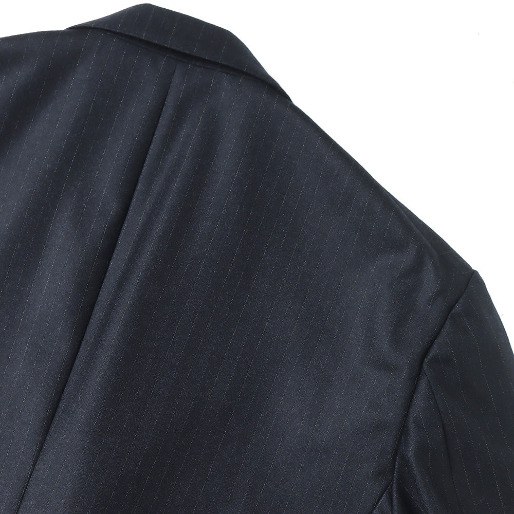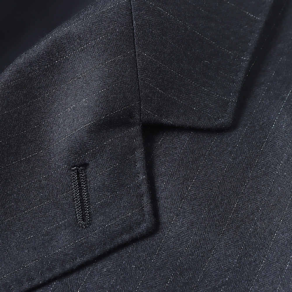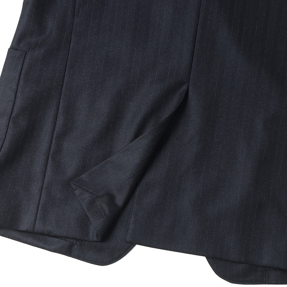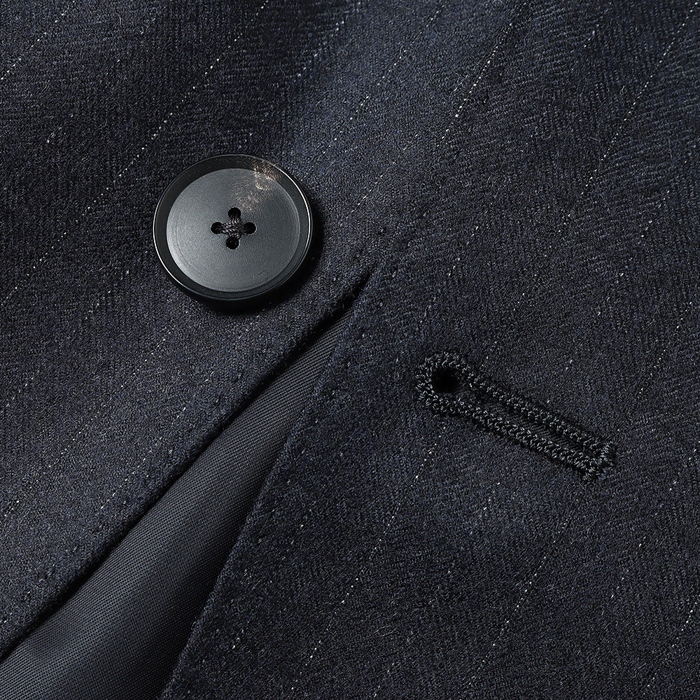 Super180'sの梳毛トップ糸を使用し、ヘリンボン組織の中にシルクを織り込んだストライプ柄素材です。時間をかけて縮絨させ、キメ細かく上質な光沢と滑らかな質感、そして杢糸の柔らかい色合いが特徴です。
