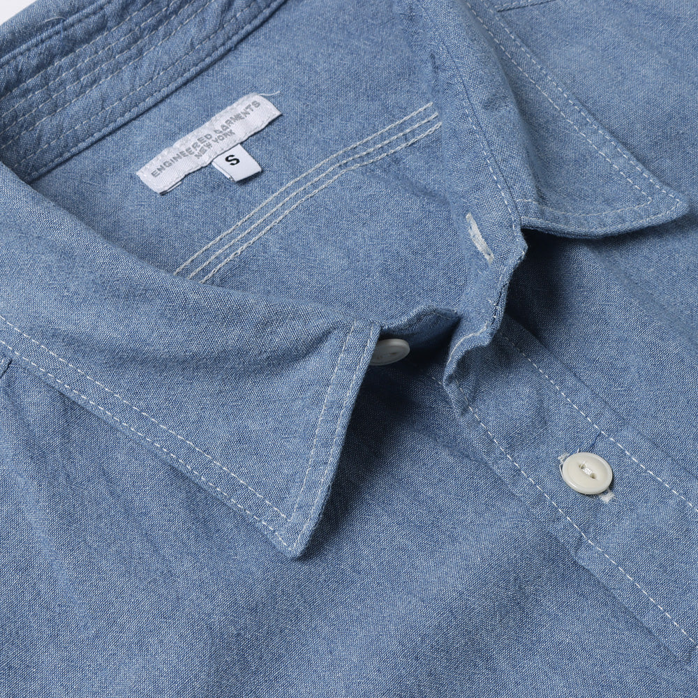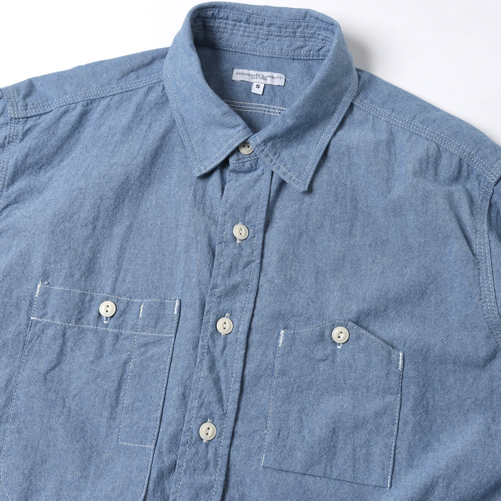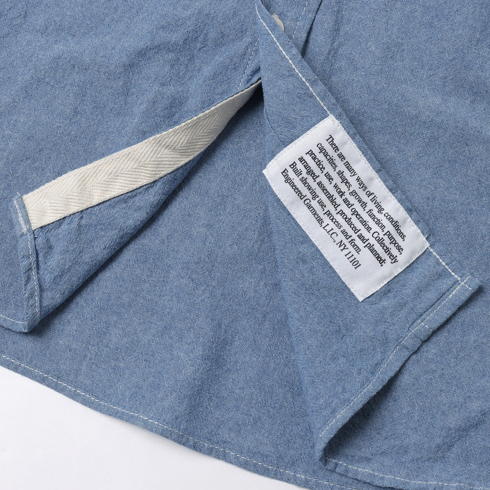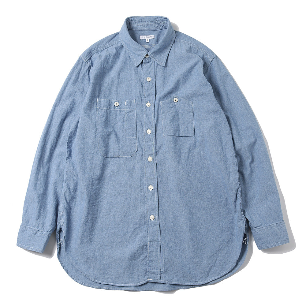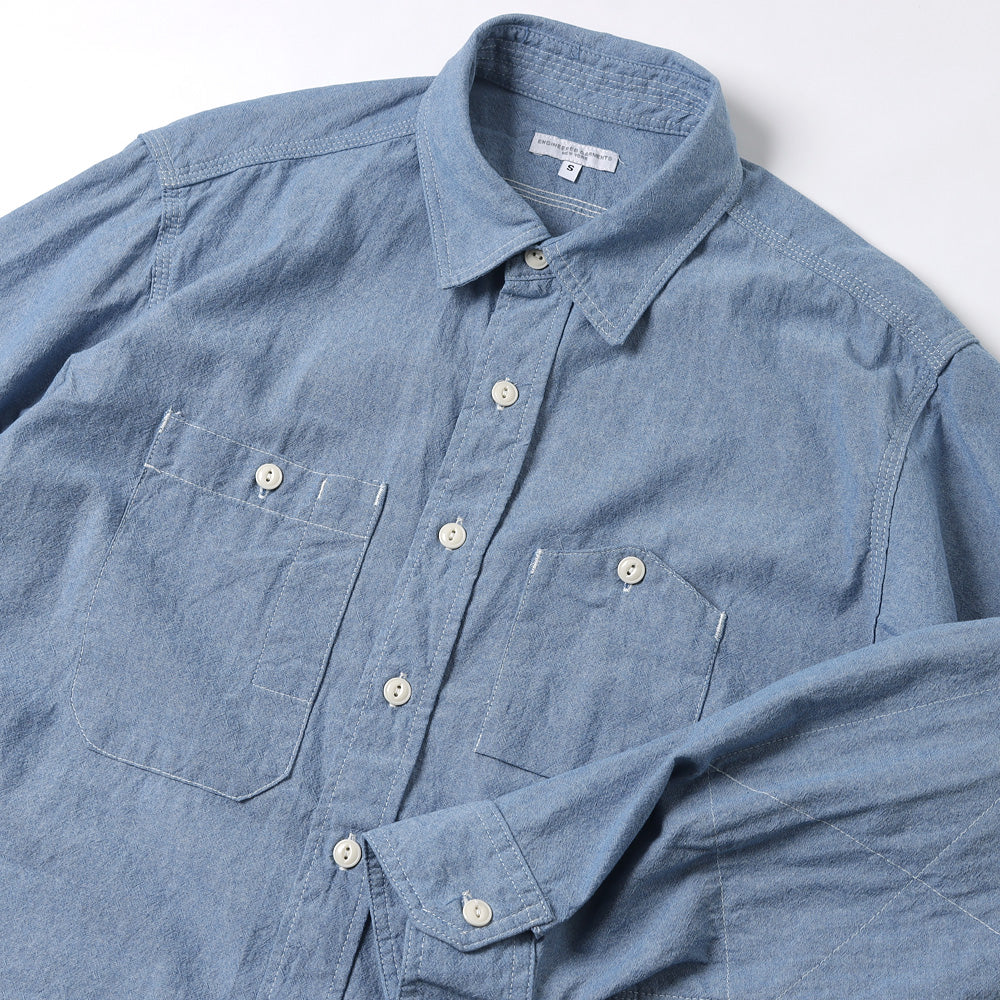ワークシャツらしくライトオンスのシャンブレー素材を使用した、シーズンを超えて活躍する一着です。