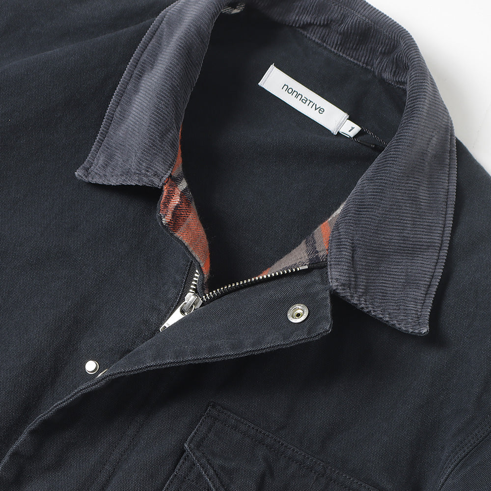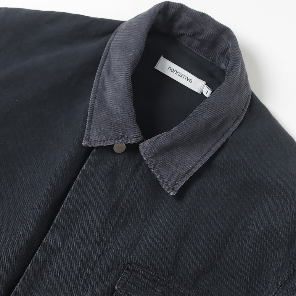 衿をコーデュロイで切替えられたカバーオールタジャケット。