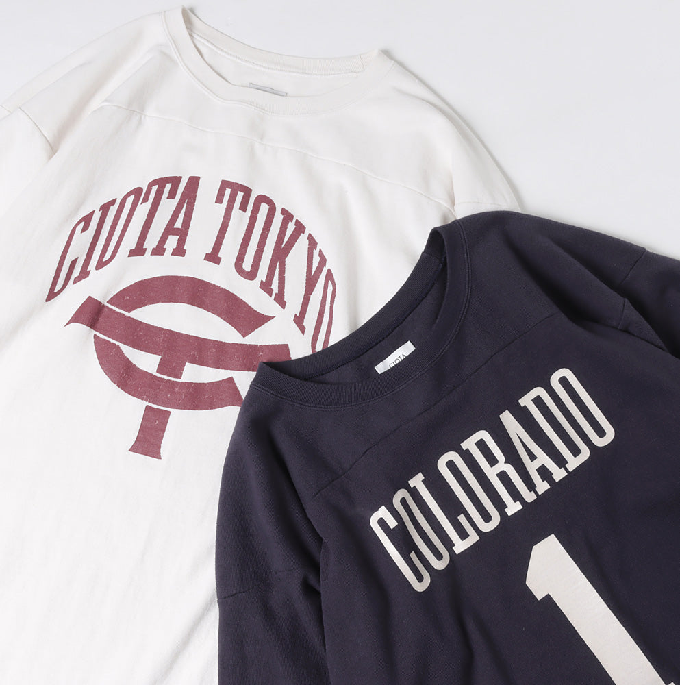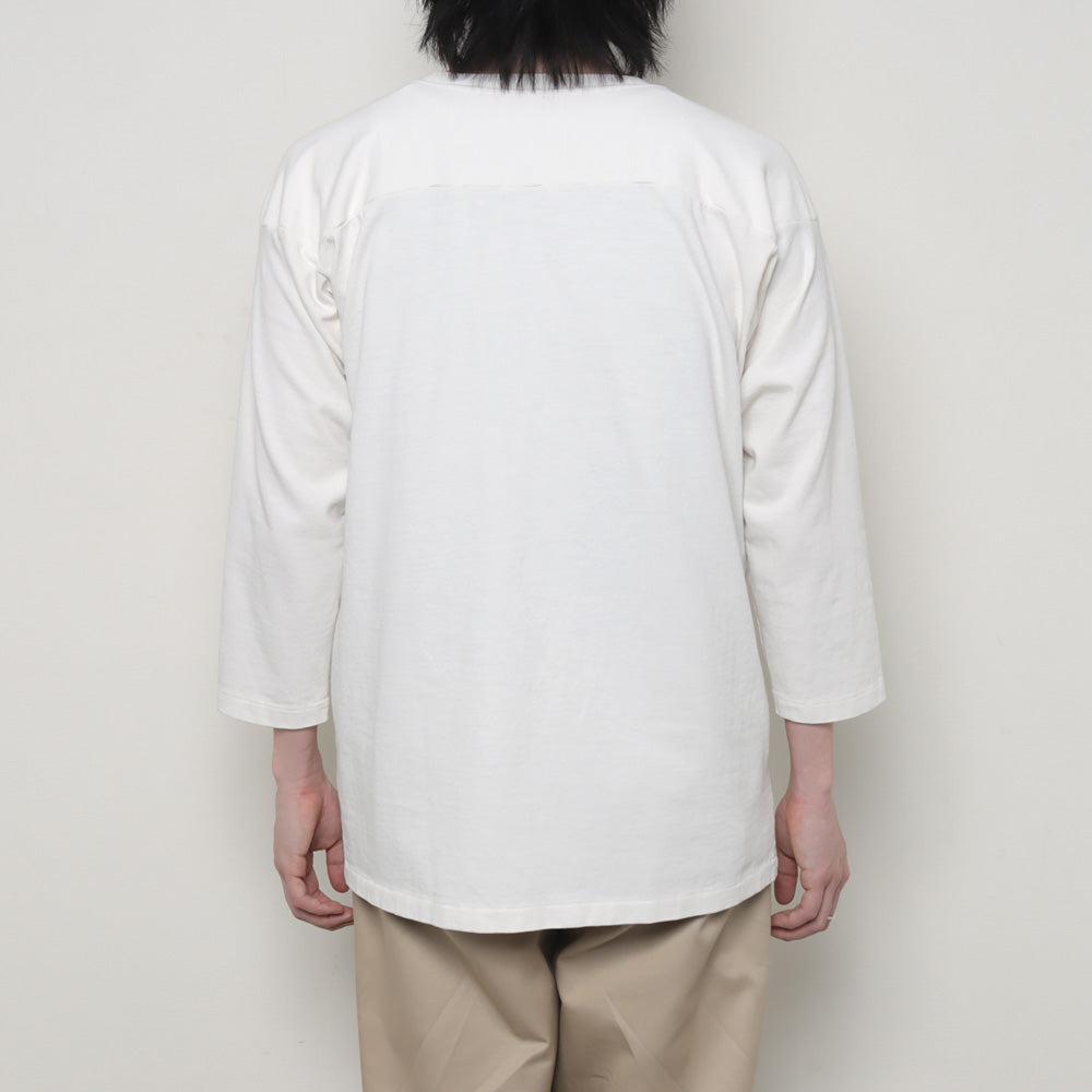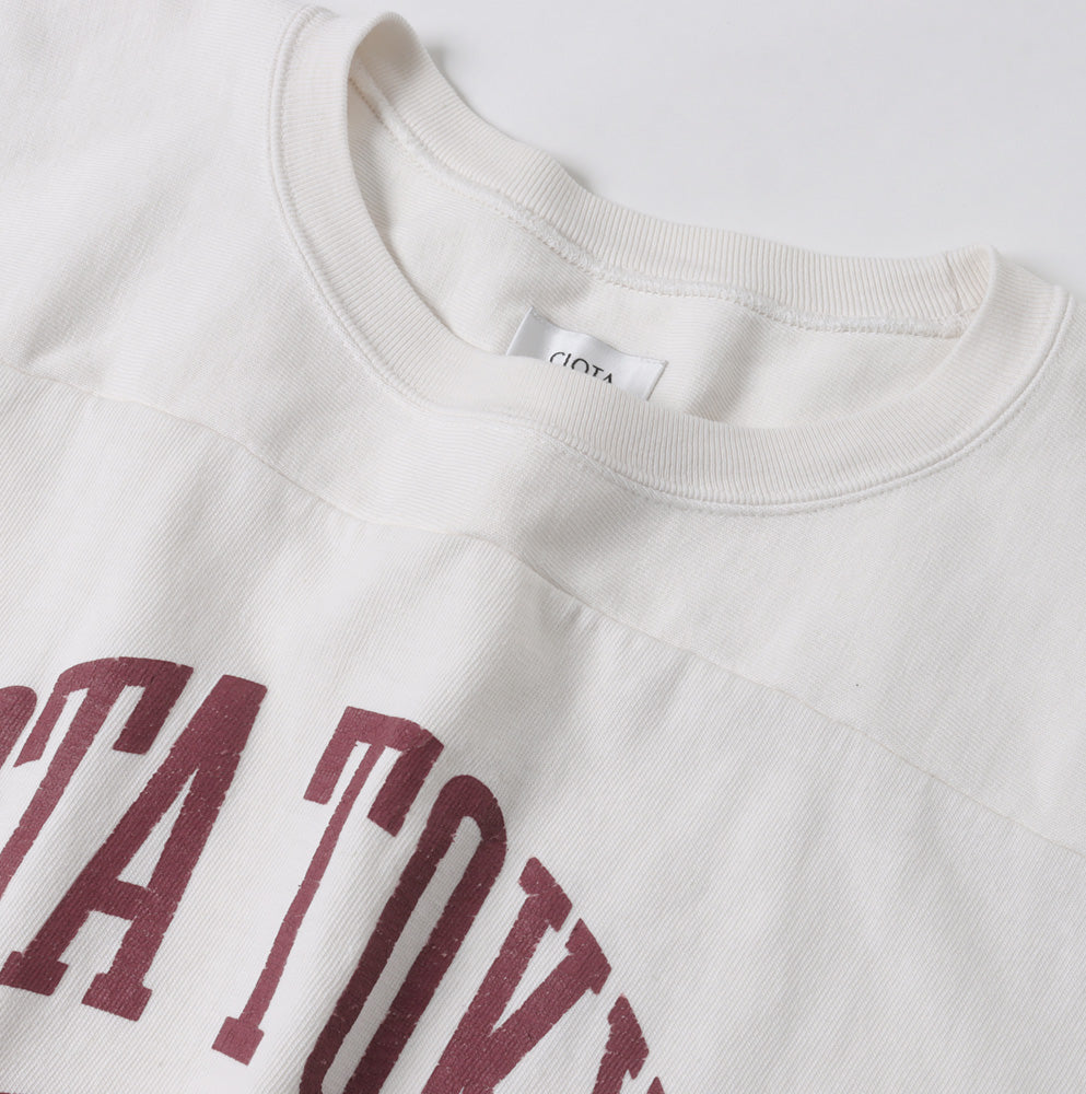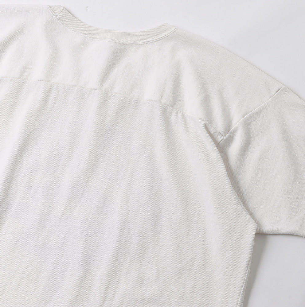 スビンコットンの中でもとりわけ希少性の高い“スビン ゴールド”を使ってフットボールTシャツを作りました。デザインは1970年代のヴィンテージをサンプリグしています。スビンゴールドの特性である、シルクのような光沢とカシミヤのような肌触りを最大限に活かすならば、毛羽立ちを抑えるコーミング加工を施すのが一般的ですが、こちらはナチュラルな風合いを残したカード糸。太さは12番手で、スラブ糸(フシのある糸)を使用することで、ラフな表情に仕上げました。それでもスビンコットンの滑らかなタッチは十分に体感いただけます。